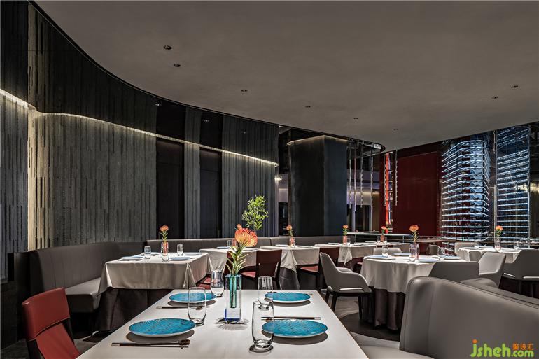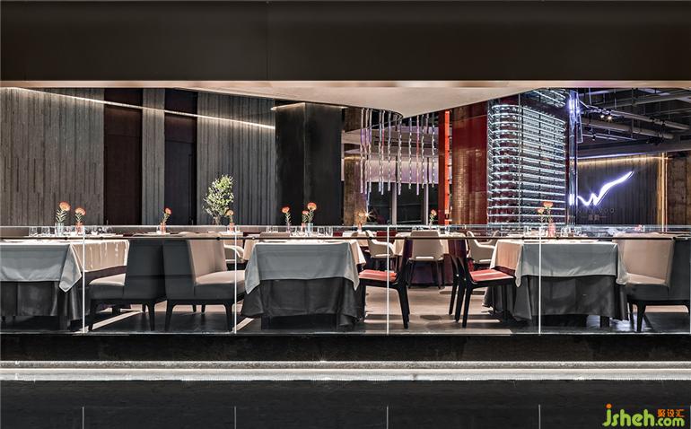 在萬蔚的空間策略中,如何能將自在悠閑又懷揣十足好奇心的食客迎進店里是設(shè)計師的第一個課題。餐廳設(shè)計師吳為將餐廳散座區(qū)連同中央酒窖整個向商場公共空間打開,極具張力的空間形象如同“黑洞”一般擁有吸聚力量。
