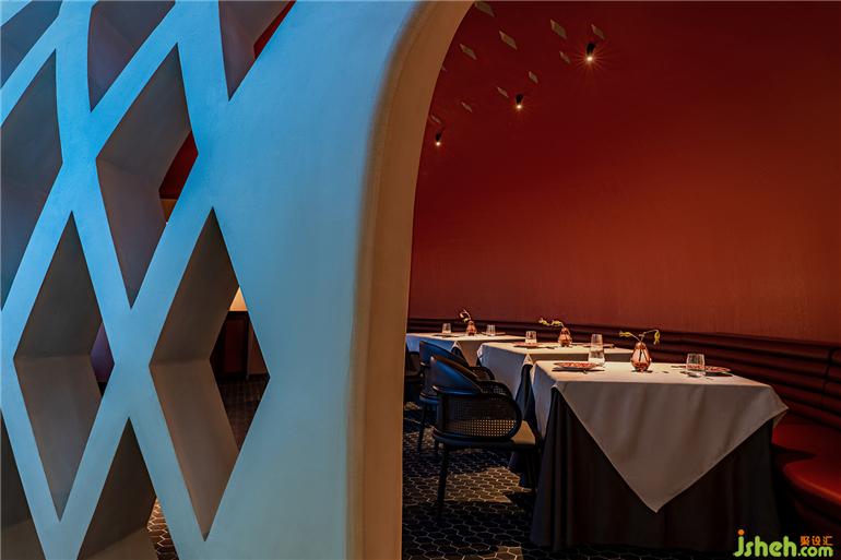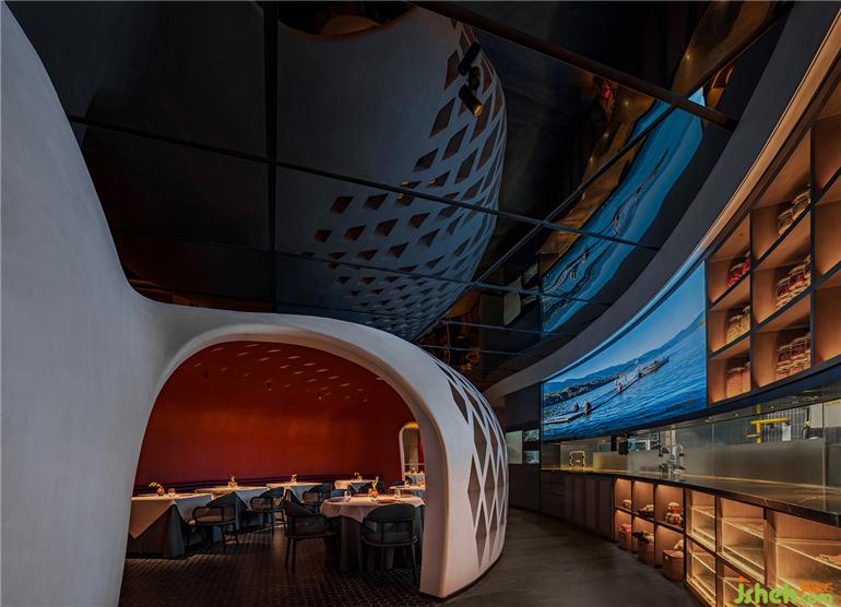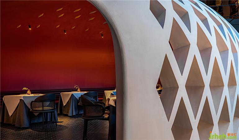 曾經(jīng)在一人指尖的竹篾編織轉(zhuǎn)化為鋼筋水泥的巨型構(gòu)建,堅硬沉重的現(xiàn)代材料被巧妙地輕輕放下——時間已飛逝,餐廳設(shè)計而煙火氣與匠人之心永續(xù)。