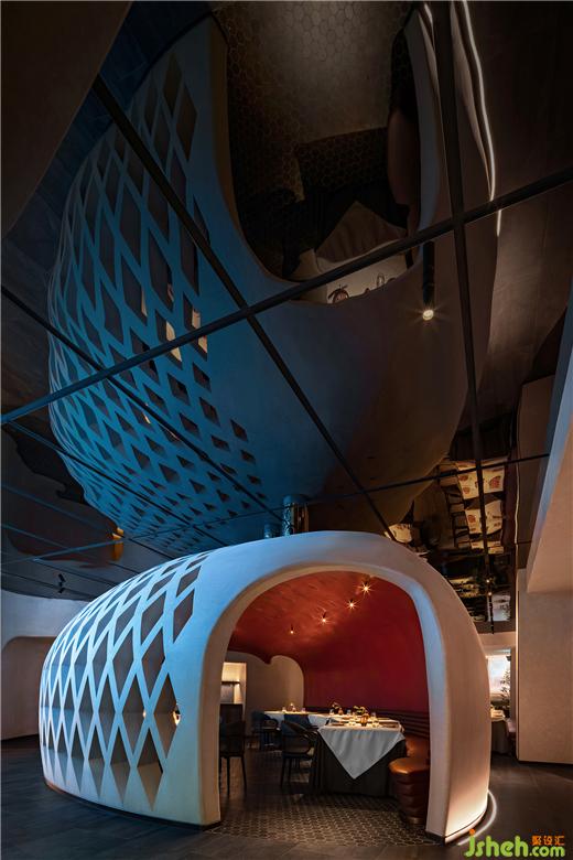 餐廳設(shè)計受限于施工難度和成本,腔體建造未能以3D打印技術(shù)實現(xiàn),而是以更傳統(tǒng)的鋼筋結(jié)構(gòu)層層搭建,現(xiàn)場對形態(tài)、曲面及細(xì)部的校準(zhǔn)同步進(jìn)行,這一具有實驗性的創(chuàng)造由許多人共同完成,最終得到和設(shè)計原稿接近的結(jié)構(gòu)體。