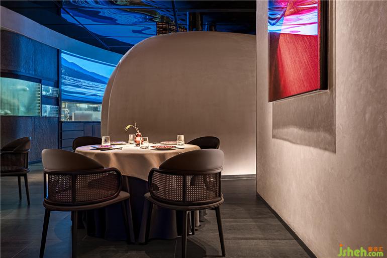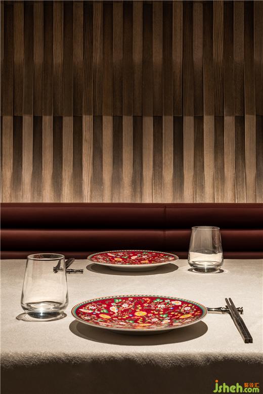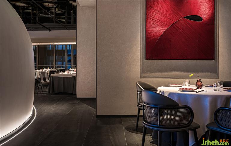 紅色純粹鮮明地以大塊面或藝術品形式渲染、點綴,在藝術館般的灰白層次里攪動起喜慶、活力和辛辣的味覺,直到視線落到芙蓉花淺盤。由虛向?qū)?、亦舊亦新的一支空間舞曲婉轉收尾——食客落座、爐灶沸騰、辛香炸開、食指大動。