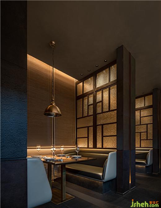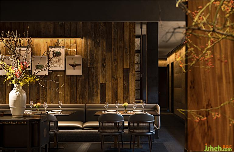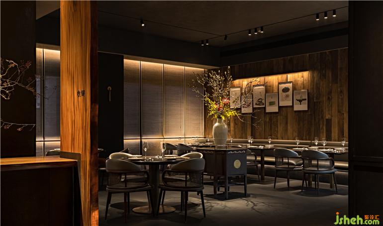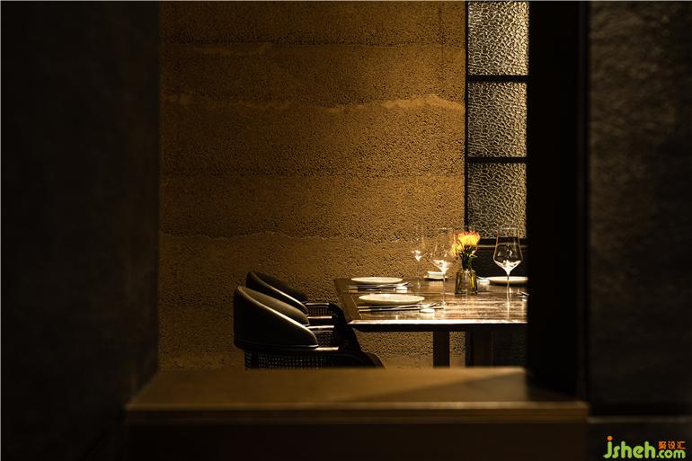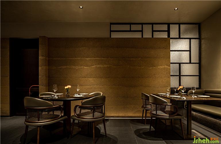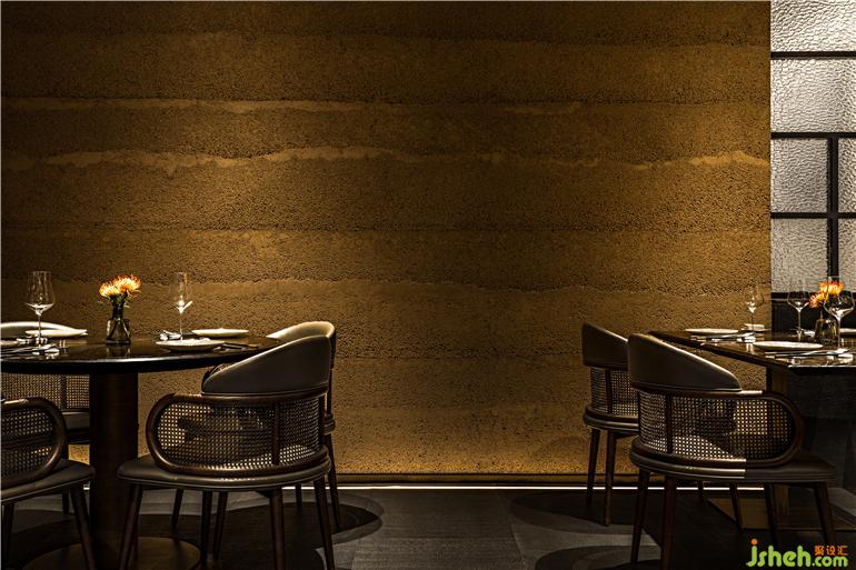室內燈光氛圍溫煦,起承轉合、疏密有致,老榆木和夯土在立面大量使用,前里臺州魚市餐廳設計使空間整體氛圍質樸而富有溫度,夯土的自然肌理使其在燈光下猶如金箔帷幕,與傳統(tǒng)黛色地面呼應形成內斂厚重的底色,這種由原始材料帶來的精致現(xiàn)代感歸功于設計的整體把控,以及權衡材料比重和燈光渲染的綜合結果。