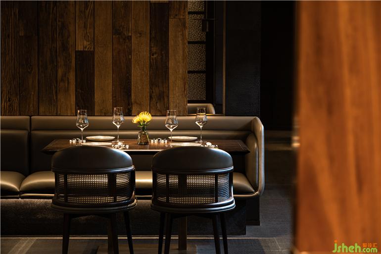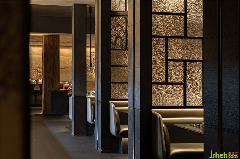 餐廳家具的選擇在形態(tài)和材質上盡可能結合了傳統(tǒng)設計和現(xiàn)代材料,前里臺州魚市餐廳設計以確保舒適度和風格匹配,深灰色皮革大量使用與傳統(tǒng)木材質結合,帶商務感和家庭感的平衡。