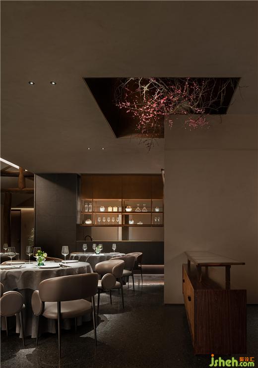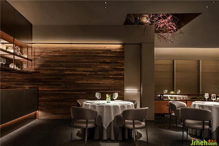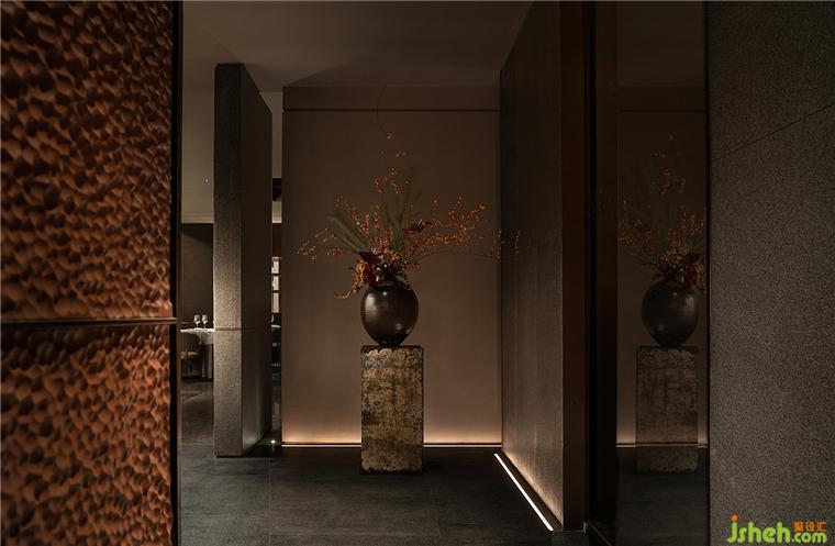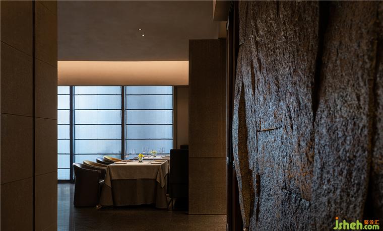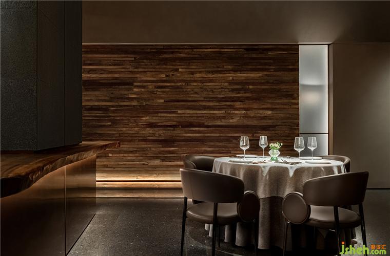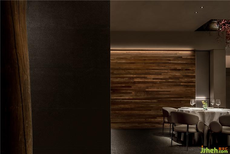 劈鑿厚重的山石立面和紋路深刻的老木板粗獷地勾勒了臺州開闊的山海精神;禾苑餐廳設(shè)計混合著蝕刻黃銅、斑駁灰磚、大理石、舊木板的空間將古老的江南民居疊映在上海之上;石墩木柱曾撐起沿革千百年的古老建筑,在新城市發(fā)展的風(fēng)云際會中漸漸隱入歷史的煙塵,在簡潔素然的現(xiàn)代底色前驚鴻一現(xiàn);城市華燈初上,東方和西方在同一底色中彼此相容。