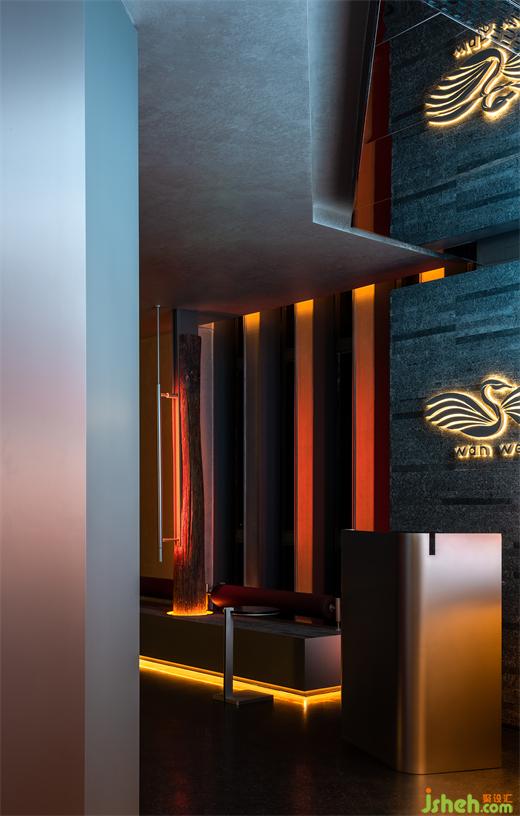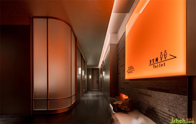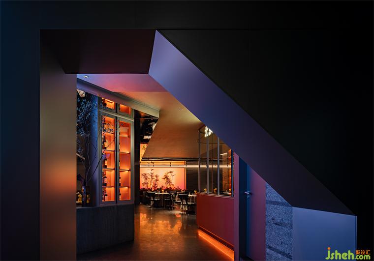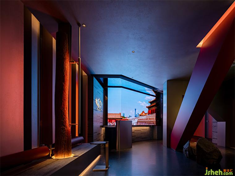 由入口至開放的散座區(qū)經過一段折廊,新舊北京的城市影像前,古老的木梁與重力感十足的傾斜結構體一古一今,餐廳設計利落輕盈的金屬材料的加入為細部注入了現代感,等位區(qū)也不著刻意,延續(xù)了這一區(qū)域的體塊互構又完全滿足了實用性。山石水景皆以表意為主,打破傳統的空間構成使這些自然風物有了更多觀看視角。