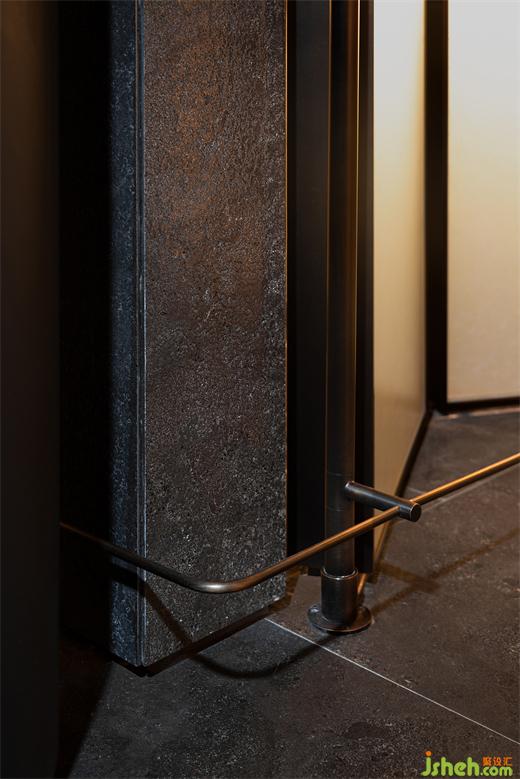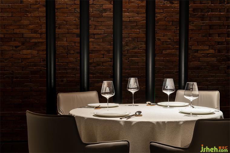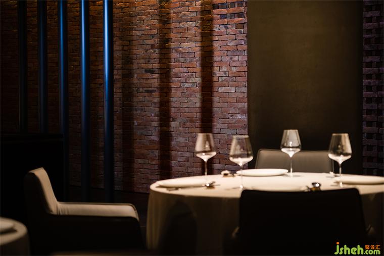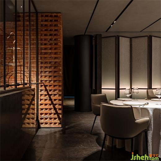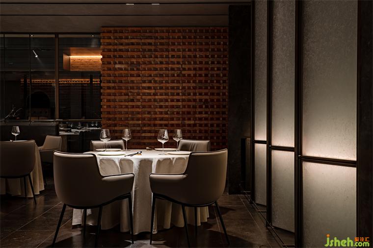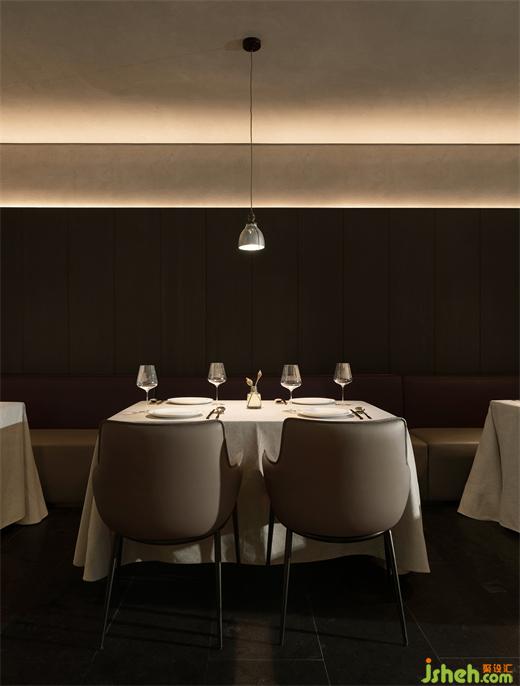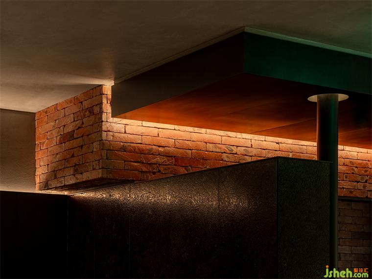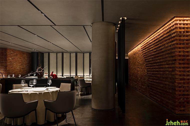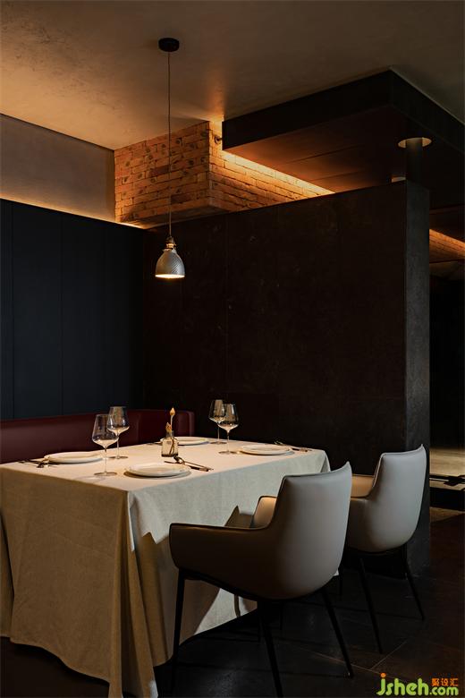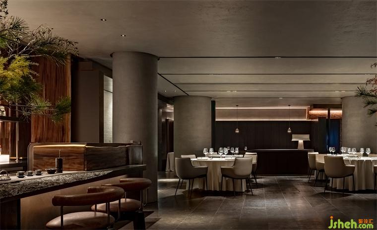 像放映一卷珍藏已久的時間底片,空間沉入一塊深沉典雅的布景中,從進入的一刻便重置了人們之前的空間體驗。餐廳設(shè)計在灰色基調(diào)中,天花使用了較淺的灰和大地色,燈光如月光漏下,表面肌理細節(jié)在柔和的光影下無盡變化,這一設(shè)計彌補了地下空間無自然光照的劣勢,并巧妙地借暗調(diào)營造令人舒緩沉浸的氛圍。