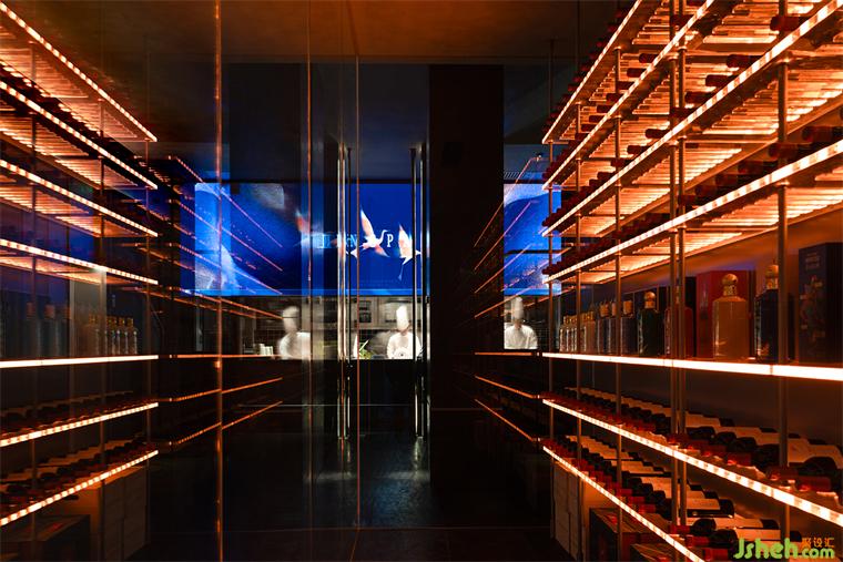 一層明檔是進出餐廳兩次必經(jīng)的通道,它是一個煙火氣和當代感十足的序幕以及謝幕,食客進出都能觀察到廚房紅火忙碌的備餐過程,巨幅LED屏和酒窖共同營造出迷人的燈光效果和融合體驗,創(chuàng)造出一種充滿參與感和本真的用餐體驗。