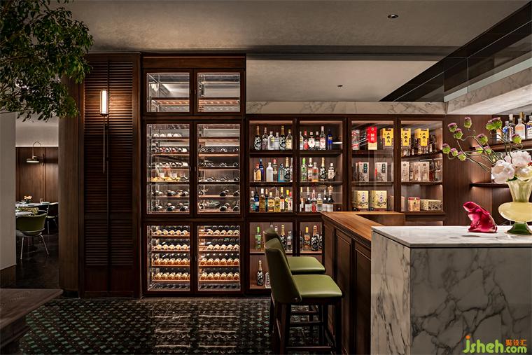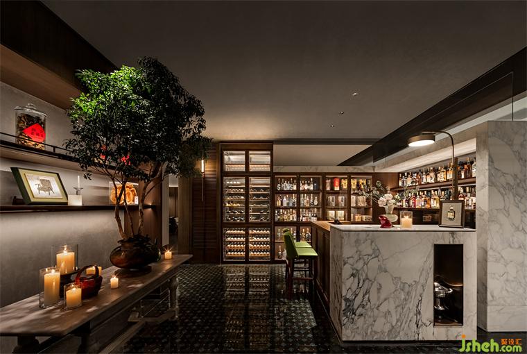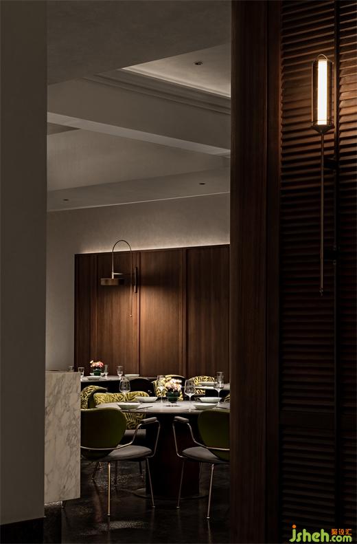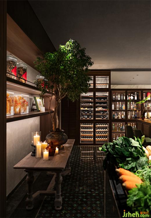 鮮活肉檔、食材展架、酒窖吧臺在入口儼然營造出生動考究的煙火場景。隨著轉過酒柜進入散座區(qū),空間收緊又忽而敞開,進入前的喧囂如泡沫在身后破碎了。散座區(qū)寬敞完整,充分的開放性并不傷害功能,寬大的多功能臺恰好使走廊和就餐區(qū)分隔,一動一靜、一古一今,交錯并行,使餐廳也有了博物游觀的樂趣。