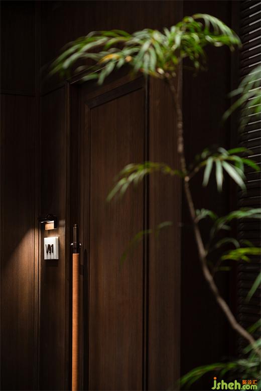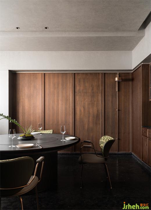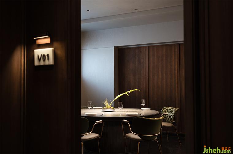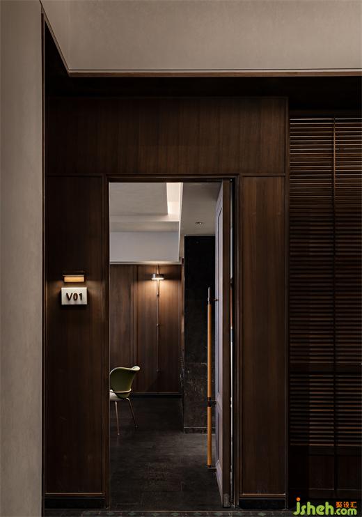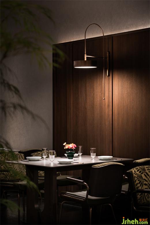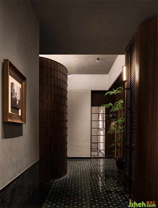 沿花磚廊道至包房區(qū),木飾面包覆的半圓結(jié)構(gòu)柱陡然打破平直的空間,婉轉(zhuǎn)的流動(dòng)性將客人吸引至更深處的空間。火鍋設(shè)計(jì)空間曲率的一點(diǎn)變化像畫師腕力一轉(zhuǎn),畫中鳥獸隨即靈態(tài)必現(xiàn)。角線片段式地編織進(jìn)天花結(jié)構(gòu),低調(diào)不失輕巧地致意古典。人們總對(duì)起伏跌宕的敘事著迷,空間亦如是,在變化的韻律里,煙火趣味生生不息。