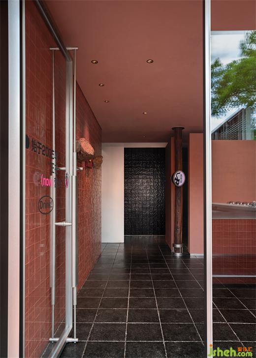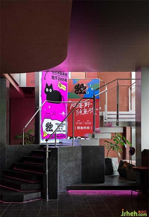 烤魚餐廳設計用鋼筋和玻璃做建筑骨架勾勒出橫豎兩個半開放的盒子,透過玻璃能看到簡潔的扶梯組織起建筑動線并從內部連通兩個空間,同時將食客引向寬敞的屋頂露臺——簋街街景在那里盡收眼底。