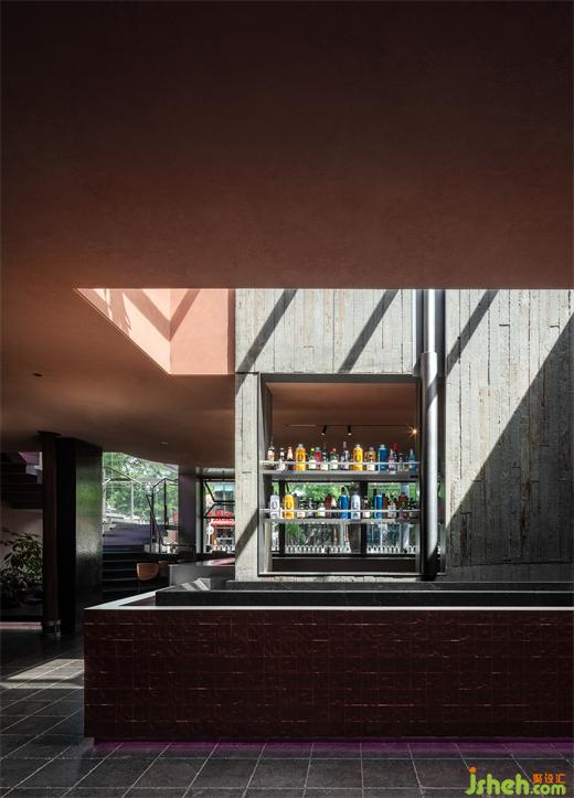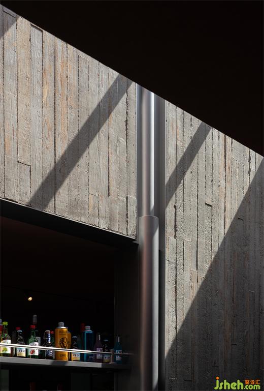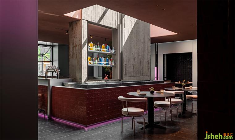 餐廳內部在設計上與建筑保持著一致的呼吸感,除了靈魂般的二層露臺,垂直方向上設計師在U型吧臺位置開矩形天窗,傾瀉而下的自然光縱貫空間,使中央吧臺兼具宴飲活力和自然韻律,流水、景觀、植物片段式穿插期間,散座區(qū)因此一掃沉悶。