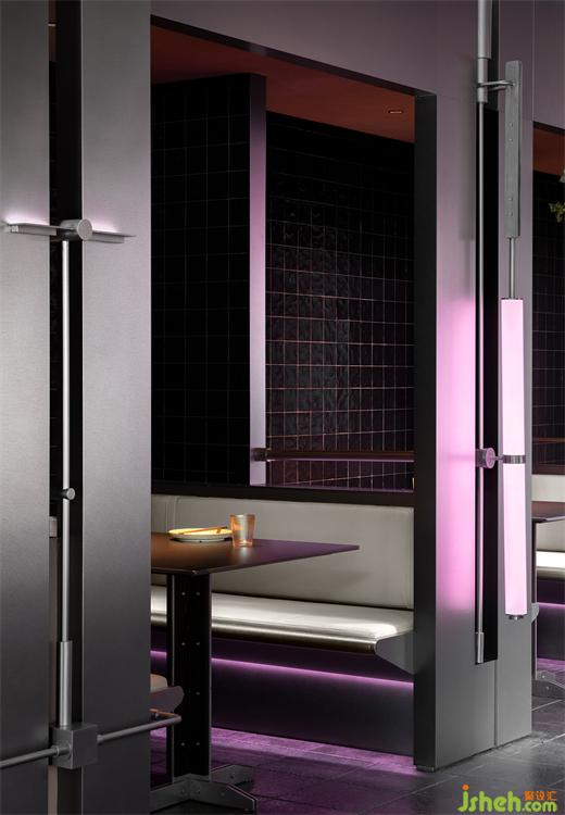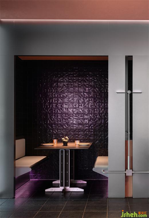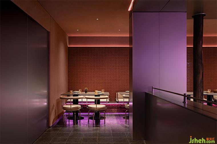 烤魚餐廳設(shè)計(jì)師運(yùn)用大膽色彩和冷峻的金屬材料將空間籠罩在一種復(fù)古未來的光彩中。氛圍的達(dá)成一部分來源于未來主義,另一部分則是機(jī)械所代表的現(xiàn)代主義,設(shè)計(jì)從近一個(gè)世紀(jì)的美學(xué)語言中尋找線索,同時(shí)也掙脫了具體的風(fēng)格范式。將毫不拖泥帶水的潔凈和抽象賦予金屬構(gòu)件,結(jié)合古典奇幻的燈光,復(fù)古機(jī)械感滑向未來宇宙,自由松弛的晚餐時(shí)段是一場視覺和味覺的共同“致幻”。