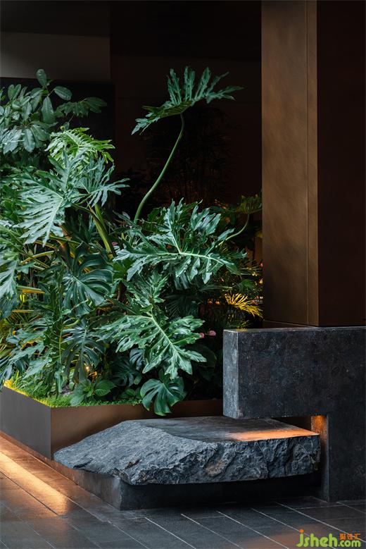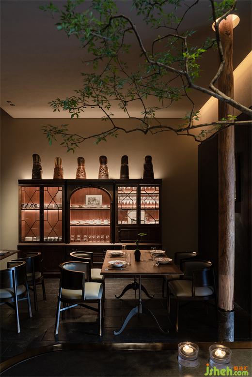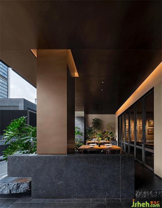犧牲掉室內(nèi)部分面積后,云南菜餐廳設(shè)計師成功創(chuàng)造出一個安靜的與戶外連接的內(nèi)庭院,散座區(qū)流暢地過度到自然光和戶外環(huán)境中,所有室內(nèi)陳舊的、低垂的、粗糲的都從這個出口涌入天光中,然后成為炫目的、高昂的、細(xì)膩的一部分,與城市再度相融。這個小小的園林意向的區(qū)域也作為餐廳的精神內(nèi)核,生息在人們對古意和自然的回望向往中。