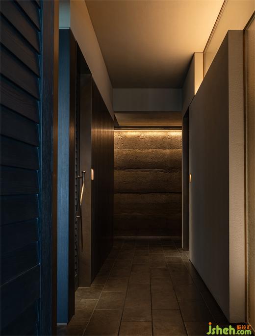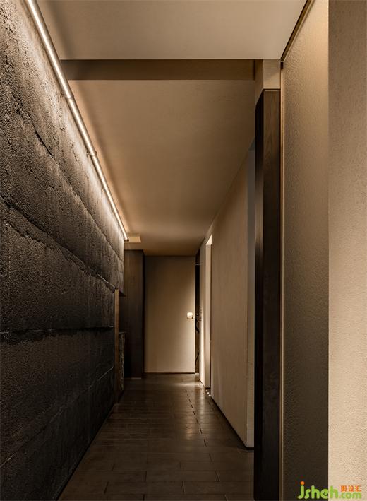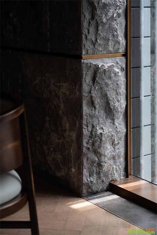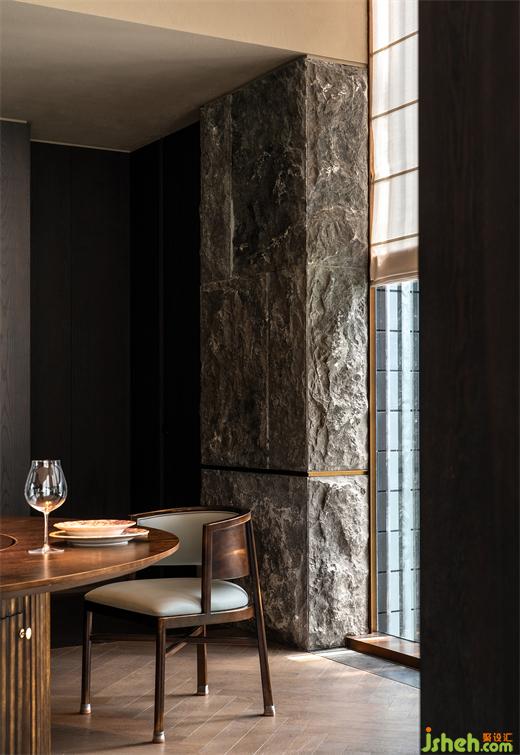 粗獷的帶有沙礫質(zhì)感的涂層包覆散座區(qū)天花和立面,磚結(jié)構(gòu)柱和相對纖巧的木結(jié)構(gòu)組合成多功能臺,同時作為散座區(qū)強有力的精神支撐,看似未經(jīng)修飾的材料和極端簡素的結(jié)構(gòu)處理將食客“放逐”在原始、自由的味覺邊地。
