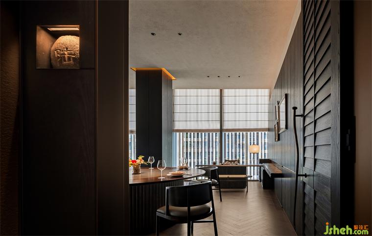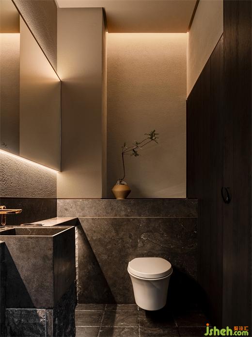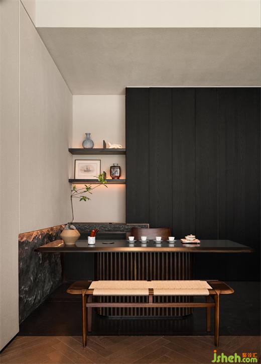 沿走廊至包房,石板磚附著一層油潤的薄光,漫漫層疊的黃土是視線盡頭的地理造像。枝形黃銅把手后,包房像一段上揚的樂章作為空間的終段。潔凈的材料幾乎不飾一物,在靜定樸拙的背景下,天光和城市從落地窗中疊映進室內(nèi),組成了一個完整的新世界。