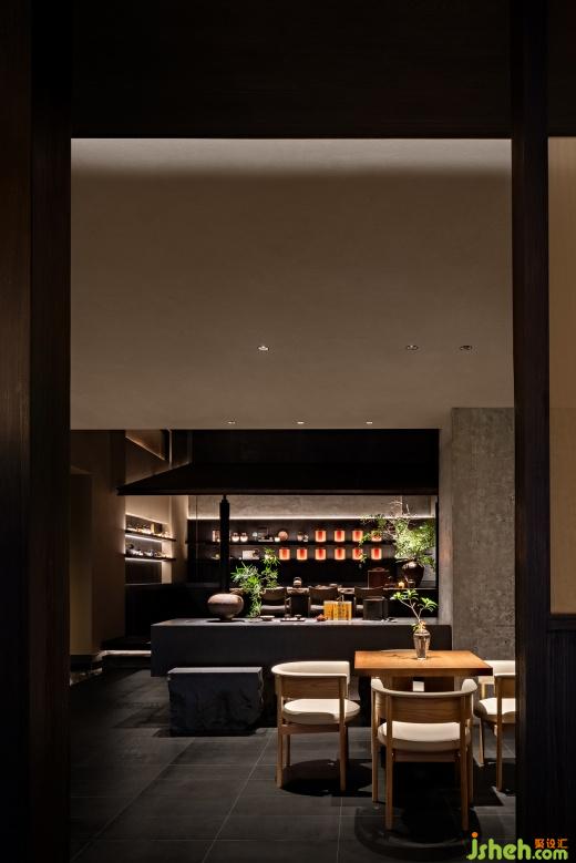 由長廊向內(nèi),散座輕盈,與屏風(fēng)、燭火自成一體,構(gòu)建出室內(nèi)的層次。沙龍亭與庭院入口對望,成為開場區(qū)域的精神堡壘。