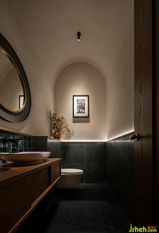經(jīng)酒柜、吧臺、冰檔與明檔,散座區(qū)豁然開朗,自然光與內(nèi)部更適合就餐的燈光彼此作用帶來了躍動變幻的光影,老榆木包覆的天花與立面和現(xiàn)代肌理穿插共構(gòu)。建筑、風(fēng)味、故事在此刻的相遇中激蕩起情緒的海浪。