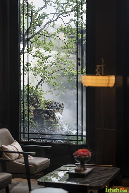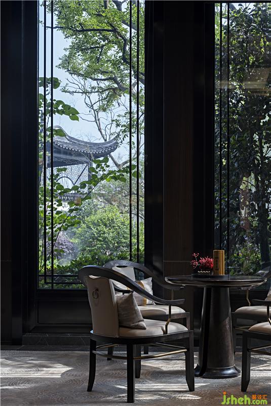 在空間的處理上,盡處造景的手法被運(yùn)用到了極致,框景氤氳,呈現(xiàn)出恰如其分的藝術(shù)魅力。窗外自然景色流轉(zhuǎn)著,與室內(nèi)氣韻繾綣相融。室內(nèi)的有限空間由此得以無(wú)限延伸開來(lái),與自然渾然一體。消弭了的空間界限,使其不受實(shí)體建筑結(jié)構(gòu)的約束,室內(nèi)外生命的自由融合,正是儒門中天人合一的哲思之智的體現(xiàn)。