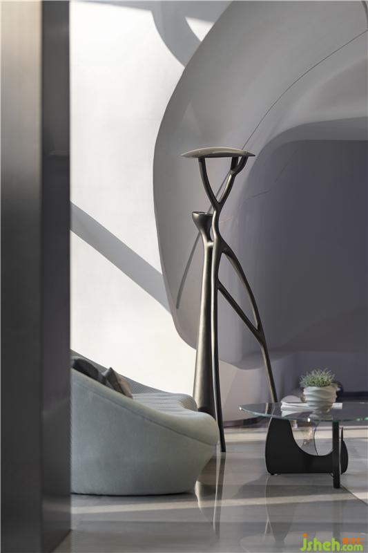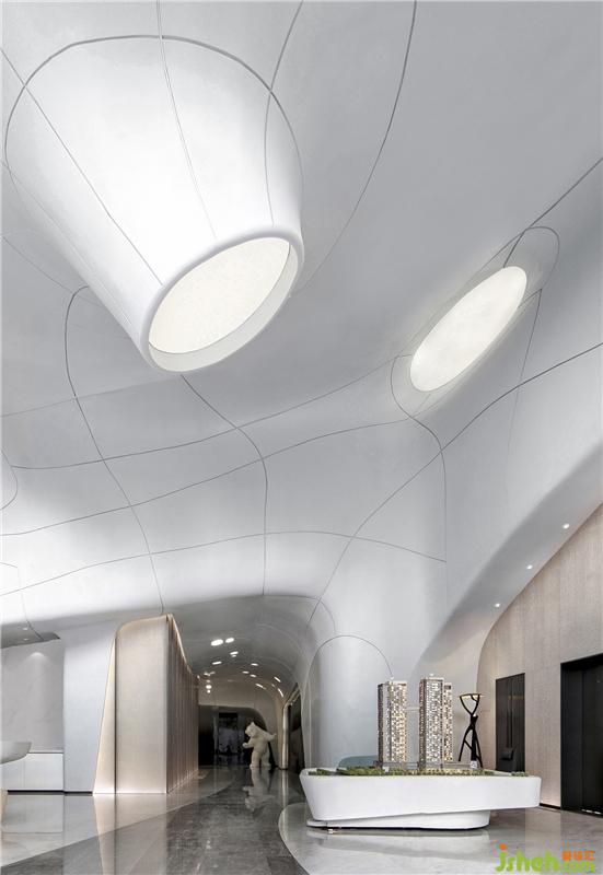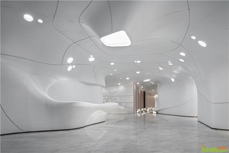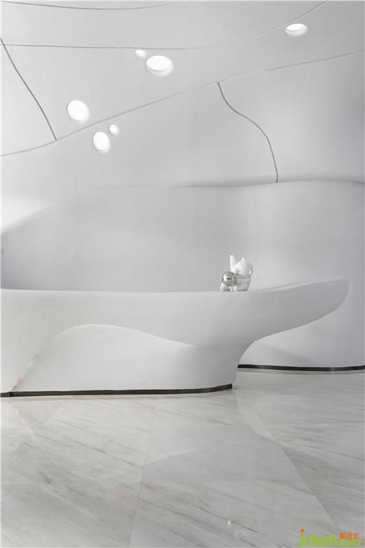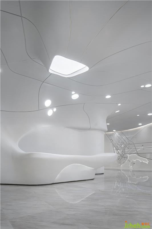 在材料的運用上,一如既往的盡可能克制著,彎曲的表面由輕盈型材料構(gòu)成,令空間生出無限種可能性,如同從縹緲間蜿蜒而來的水流、神秘的彌漫在半空之中,營造出極具未來感的場所精神與空間氣質(zhì)。無限延展而去的曲線予人視覺上的永續(xù)感,呈現(xiàn)出“少即是多”的平衡美感,減少不必要的材料消耗后,只余下本色充盈其間,領(lǐng)悟?qū)W⒌拿利?。在原始的純白中,我們卻預(yù)見一世斑斕的未來。