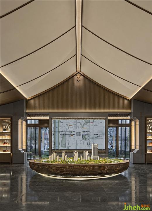 營(yíng)銷中心設(shè)計(jì)以滕王閣亭為靈感來(lái)源打造的藝術(shù)裝置,盡顯洪都亭閣與江水倒影的意境之美,以當(dāng)代藝術(shù)筆觸傳古承今,方寸之間自有乾坤。