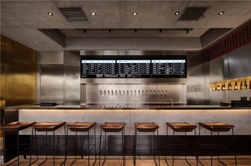 MOD精釀,面積70平米,空間結(jié)構(gòu)十分狹長,且層高又高,如果采用傳統(tǒng)的空間布局,則遠(yuǎn)遠(yuǎn)不能滿足業(yè)主的需求;故摒棄了占位面積大而又容納人數(shù)少的散座;利用層高的高度,特別設(shè)計了長吧位與卡座,不僅使容納人數(shù)提升了一倍,還營造了隨意舒適的氛圍,在這里客人可坐可站可交流,讓客人得到最大程度的放松;而且吧臺與卡座的高低錯落有致豐富了空間,也在視覺上得到了延伸,讓整個空間更加靈動。裝修公司