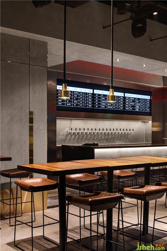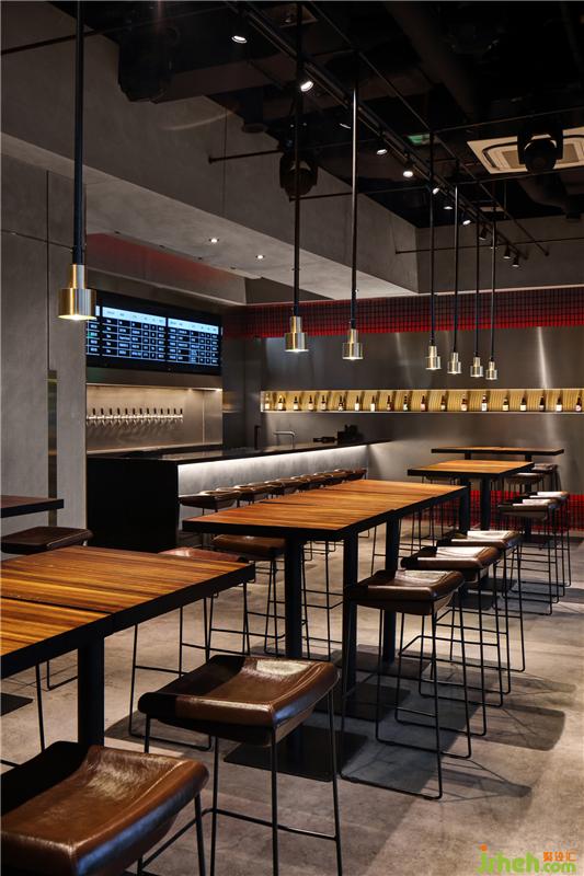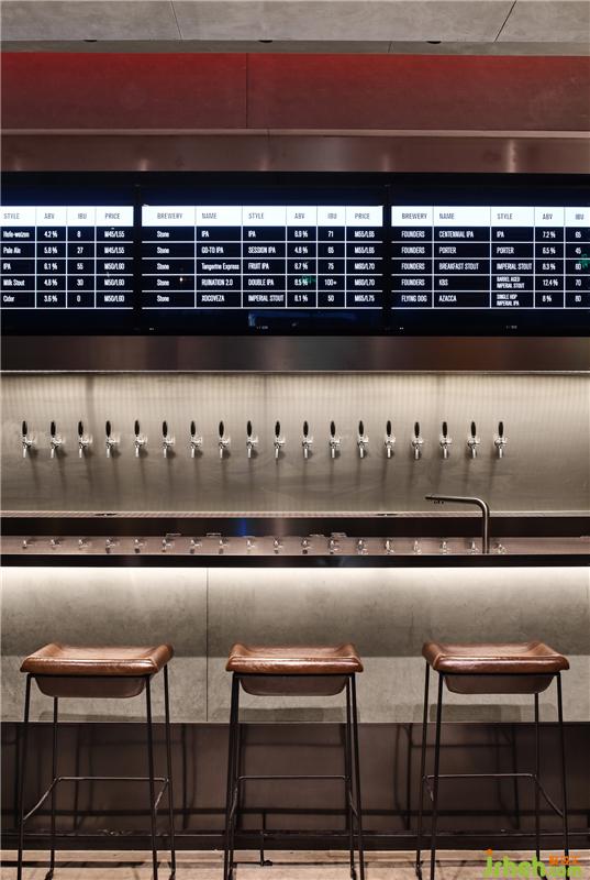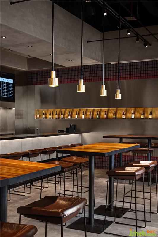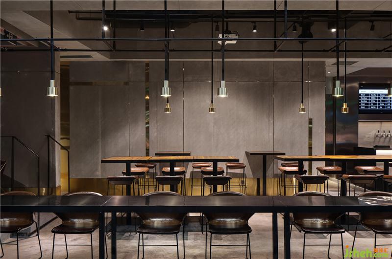 在材質(zhì)與顏色上的選用,也是極其考究,主要采用黑色、灰色,以及不銹鋼、水泥等現(xiàn)代質(zhì)感明顯的材質(zhì),新與舊的結(jié)合、碰撞,意外的和諧。餐廳設(shè)計(jì)