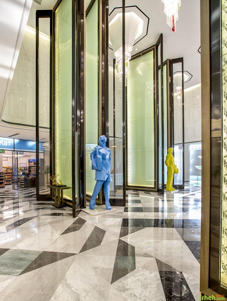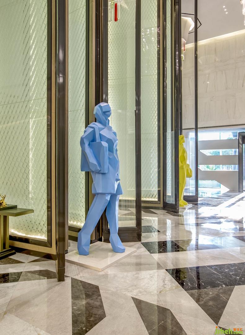 同時設(shè)計師在酒店大堂的大屏風底下設(shè)立各種不同顏色的紳士巨人迎接著來賓,體現(xiàn)商務酒店的服務性質(zhì)。