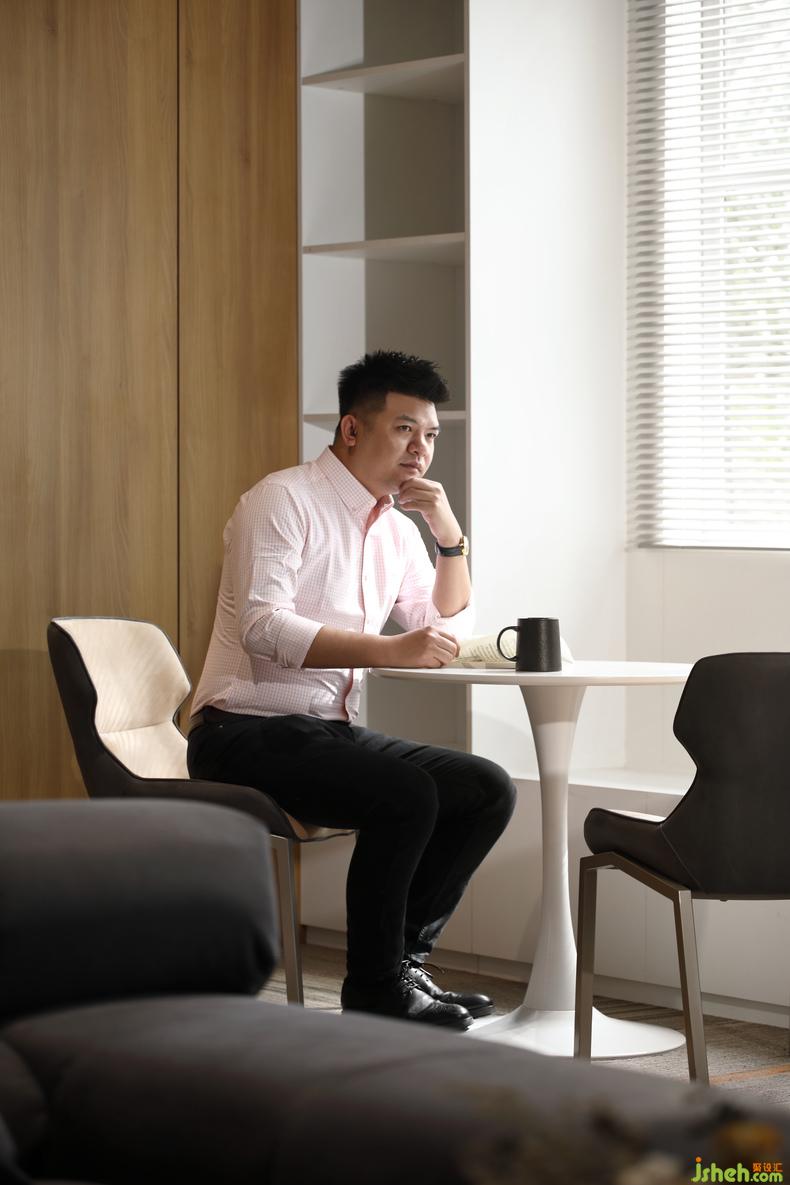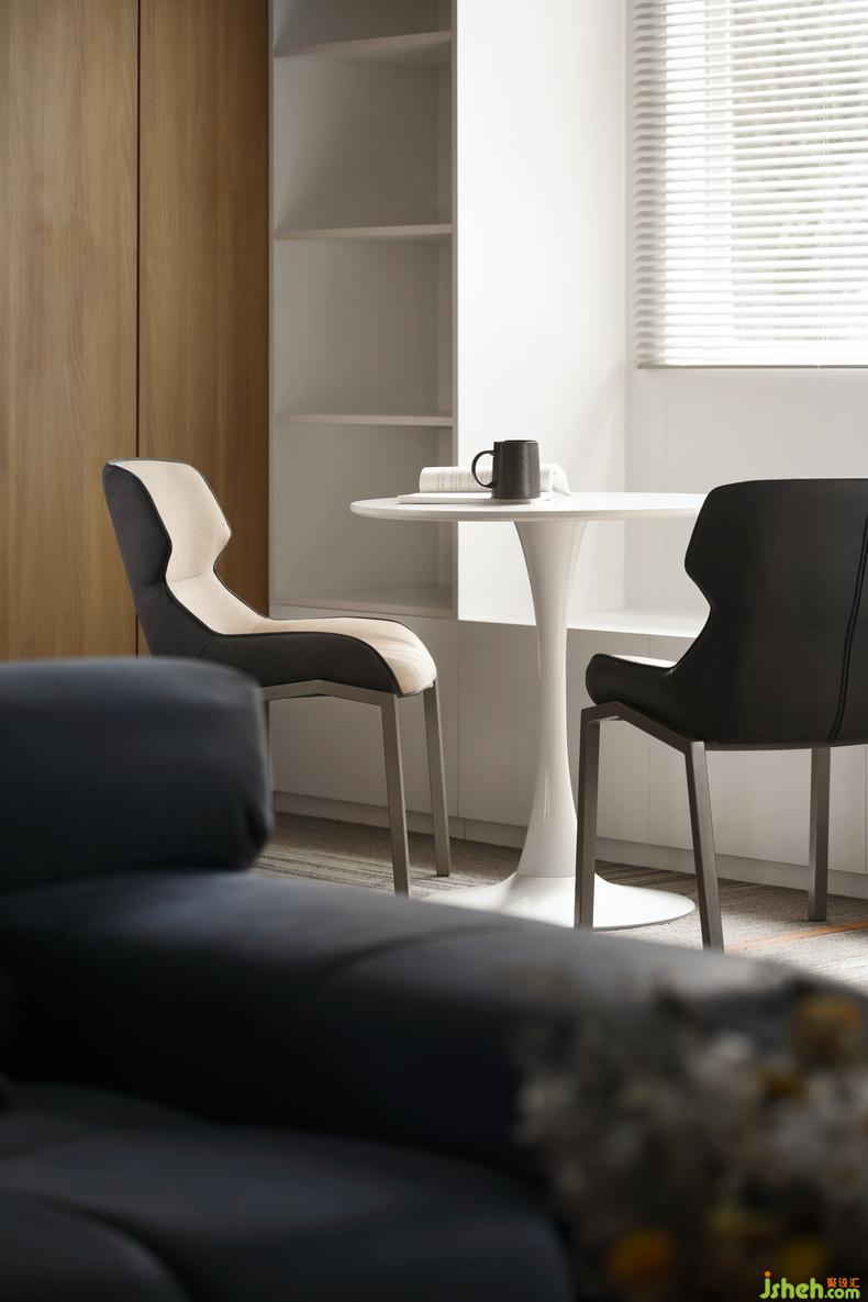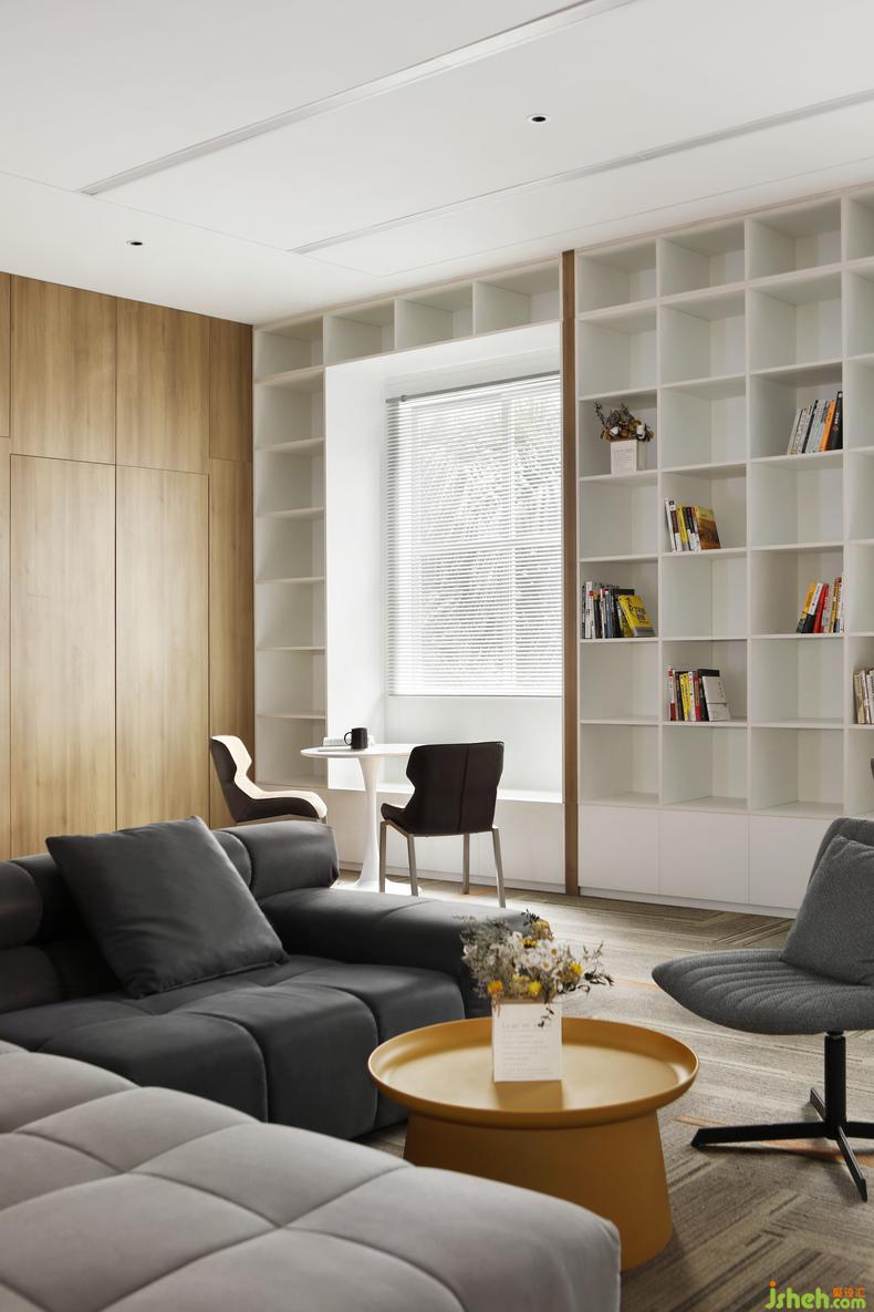 貼墻的直立書架簡潔大氣,包裹著兩扇百葉窗,坐在窗邊能夠自由地感受微風拂面,陽光不燥的時候取兩本書翻閱,一定是在緊張的工作之外最舒適的精神享受