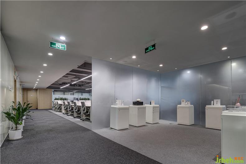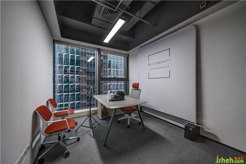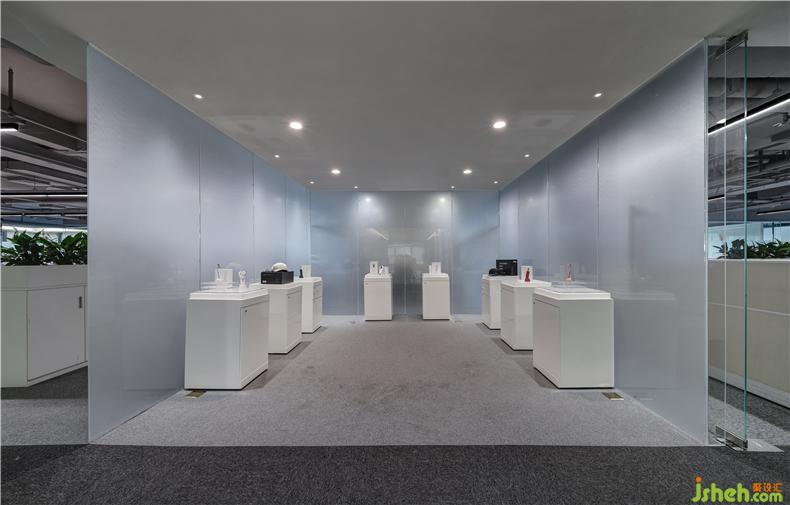 辦公室內設置了一個展廳的區(qū)域里面陳列著可思美的美容產品,讓品牌與消費者有更深層連接辦公室設計