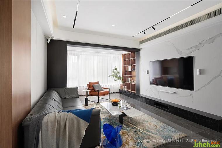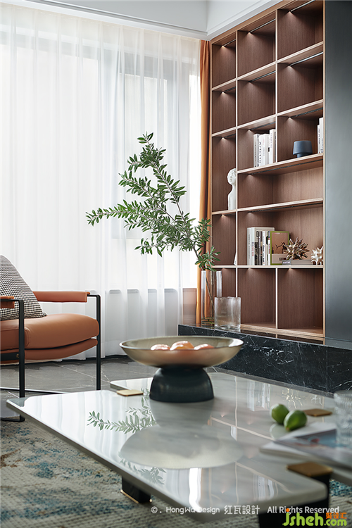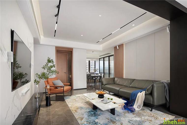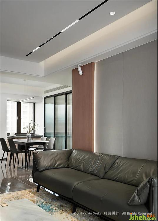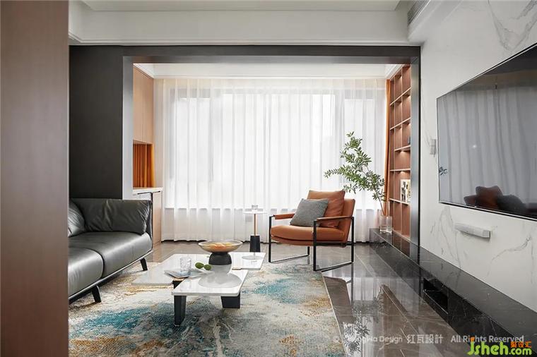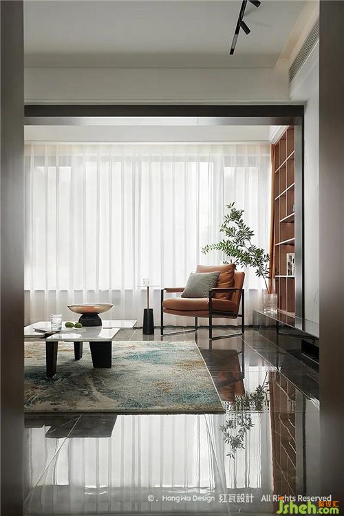 客廳高級灰用色顯沉穩(wěn)平靜,適宜的活動空間給全職在家的女主人,提供充足的空間可以陪伴家人,靠窗的白紗與棕色收納柜,給空間增添不少柔情,我們了解到男主人公是一位優(yōu)秀的航海員,通過提取相關元素,將大海的韻味運用到地毯與擺件中,整個空間透著祥和、平穩(wěn)、生趣