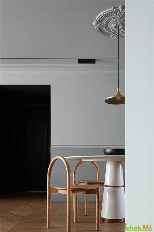 我們拆除原有的拼花地磚,以魚(yú)骨地板使房間與公共區(qū)域的地面形成統(tǒng)一,室內(nèi)設(shè)計(jì)師視覺(jué)上最大化空間感。墻面與頂部置入灰色系的漆面,局部以復(fù)古的元素點(diǎn)綴,勾勒出輕松優(yōu)雅的氛圍。