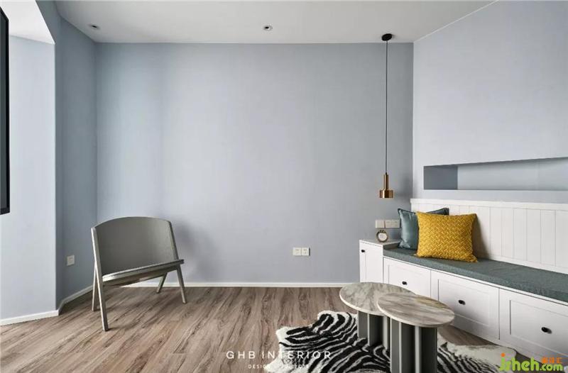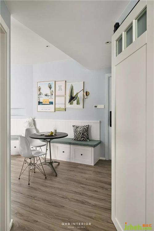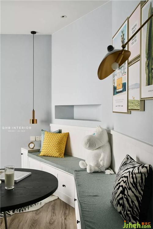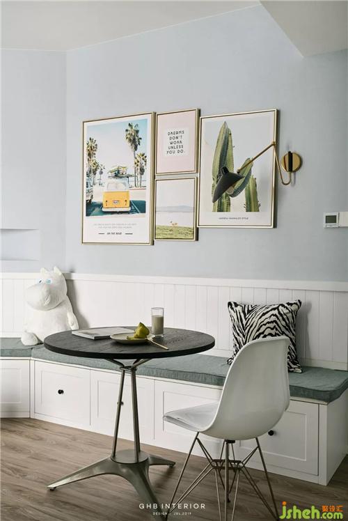 ▲ 以水色為基調,搭配木地板、白色柜體來增加空間溫度,室內設計師嘗試以清新趣味的家飾擺設,為療愈系的居住空間點綴些許的活潑幸福感。