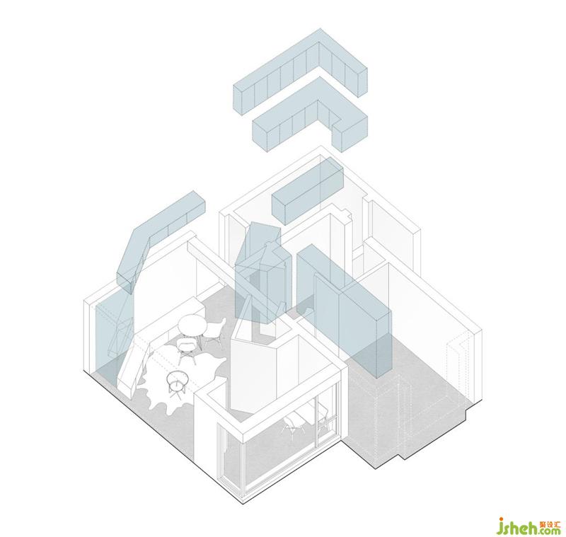 ▲ 客餐廳一體的開(kāi)放式空間,使有限面積里視覺(jué)觀感最大化,方塊幾何的變化,新生出閱讀區(qū)域和大量的收納空間,讓空間場(chǎng)域尺度的界定被打破,區(qū)域與區(qū)域之間產(chǎn)生溝通與串連的屬性。