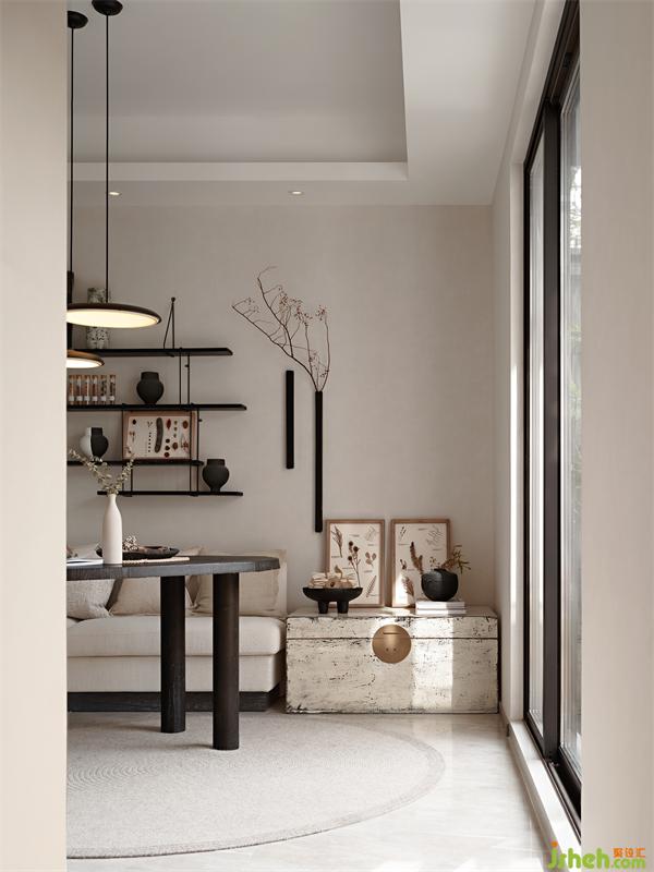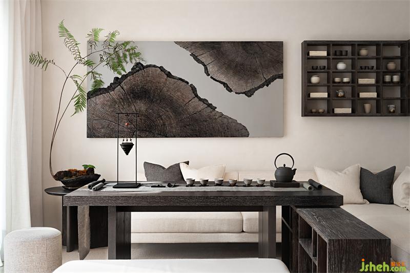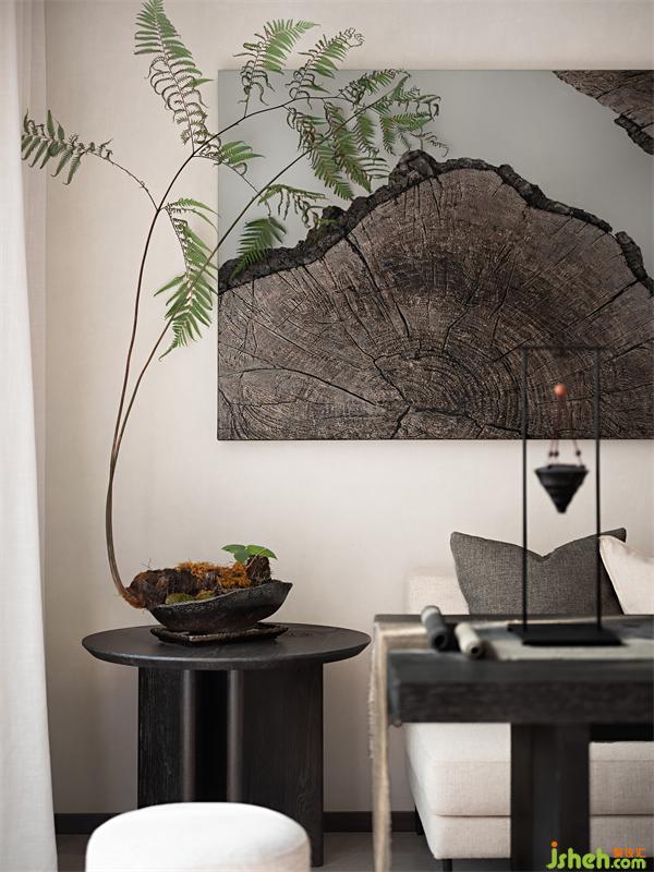 人居以融入自然為上,山間聽(tīng)取潺潺的流水。大大的院子,盈盈的笑聲,人、自然、空間···和諧與共。深木色百寶格,收納各色器玩,古意盎然,隨便從山間扦插一根綠植,就得到一片風(fēng)景,純?nèi)诲羞b一派天然。