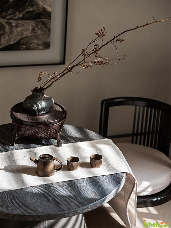 地下一層餐廚一體的樣板房設(shè)計(jì),讓生活清減中亦有豐饒。島臺(tái)與餐桌相連,煙火氣之間產(chǎn)生的每句對(duì)話(huà),都能成為活潑的生活禪。玄色木作與天然木紋相互對(duì)話(huà),還原了質(zhì)樸的山居氣息。