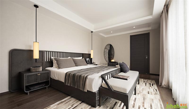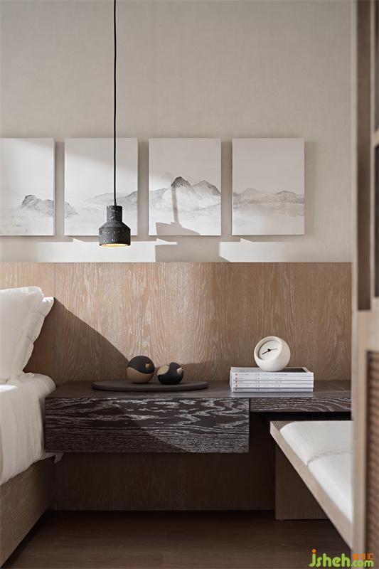 次臥床榻一體,L型邊榻與陳列柜相結(jié)合,呈現(xiàn)出一種素樸的原木感,同時(shí)配合局部的藤藝編織,柜架被賦予明式家具的靈魂,疏朗靈秀。山水畫(huà)被切割成連續(xù)感的“膠片”,蒙太奇般的在墻上打開(kāi)一扇扇“小窗”,東方的清麗素雅之美在空氣中彌漫。