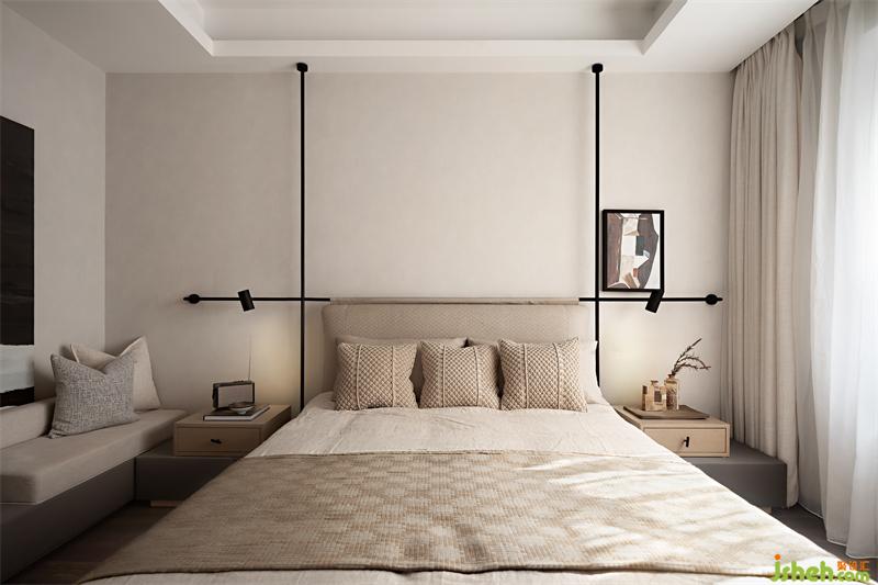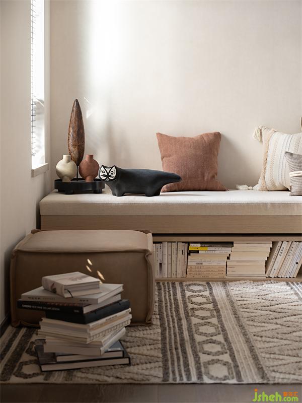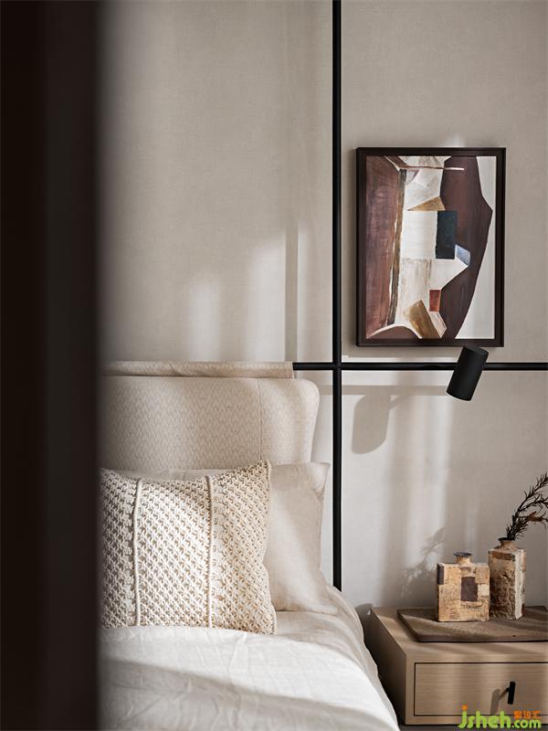 次臥中淺色的格調(diào),被床頭壁燈的暖光點(diǎn)亮。精致的原木床頭柜、亞麻床品和棒針粗毛線編織的可愛抱枕,一種小而美的舒適感,縈繞在空氣中。