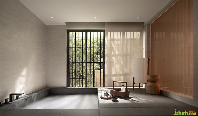 下疊餐廚空間與湯泉區(qū)緊密相連,修竹幾桿自成遮蔽的風(fēng)景。超大浴池帶來的是“溫泉水滑洗凝脂”的愜意,加之池邊提盒中梅子清酒,小酌一杯的微醺感,度假的心情隱然其中,妙不可言。