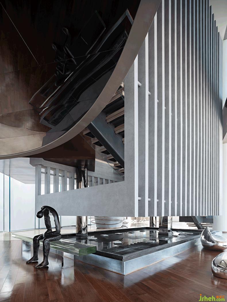 建筑大師賴特曾說,建筑是用結構來表達思想的科學性藝術??臻g中二層穿插體塊,以解構主義風格斜刺出挑,聚攏成突破性的視覺焦點,為空間內海洋因素的引入,搭建出“舞臺背景”。在地性體現(xiàn)在陳設的考量上,以漩渦為靈感,前臺以金屬飄帶自由纏繞,配合頂部藝術裝置上下呼應,再由鏡面天花倒映倍增了空間感,將大海充滿力量的生命動力和柔性之美表達得恰到好處。