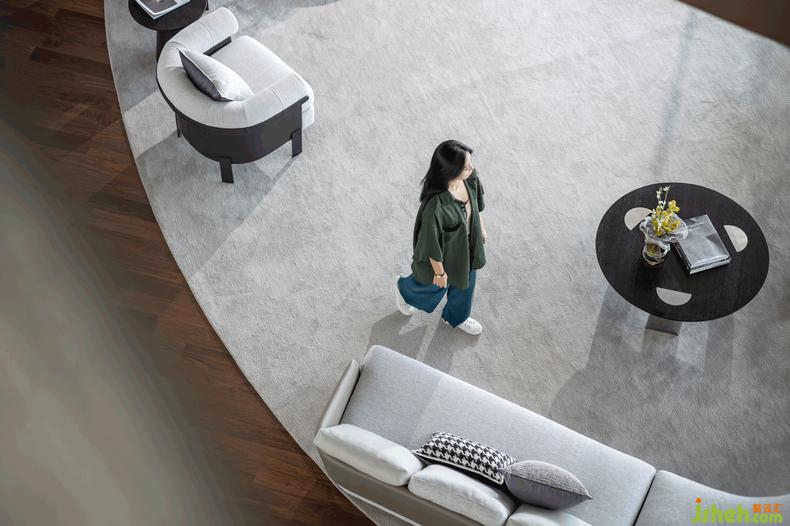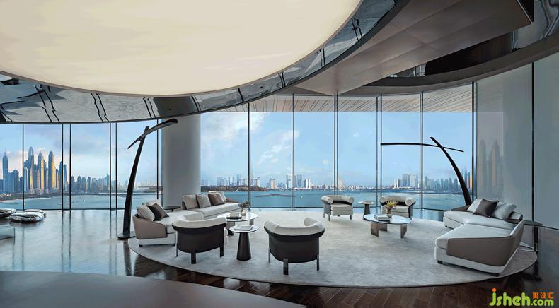 商務接待區(qū),經(jīng)過圓弧型地毯,分出圍合形態(tài)的“小島”,這些流線型線條與游艇設計如出一轍,潛移默化中注入奢華和運動基因。落地窗外是無敵美景,讓人仿佛置身游艇甲板上憑海臨風,無比愜意。