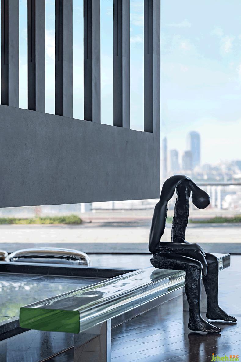 長凳人物,仿佛具有羅丹的思想者的魅力,抽象的體量和粗糲的青銅,沐浴在日光中,共同構成一幅冥想場景,隨即空間充滿了深邃的哲思意味.