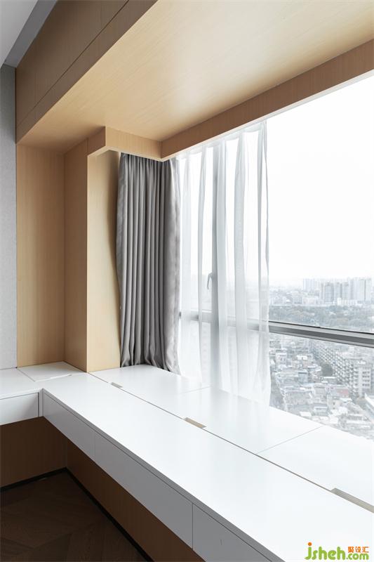 靠窗部分結(jié)合飄窗造型做成梳妝加書臺(tái)一體的桌子