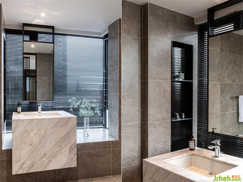 公衛(wèi)因飄窗結(jié)構(gòu)不可動(dòng),同時(shí)設(shè)計(jì)師希望業(yè)主洗漱時(shí)可以面向窗戶,擁有寬闊的視野,在早晨陽(yáng)光的沐浴下喚醒身體,洗手臺(tái)用“咬合”的構(gòu)建方式,鏡子固定于天花,增加空間的通透感,大大地提升了體驗(yàn)感和舒適度。