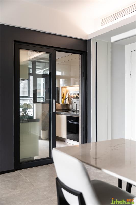 利用入戶門背面的墻厚作為收納空間,儲(chǔ)放不常用的鞋靴,齊平大門并且不會(huì)對(duì)廚房造成視覺的影響,一舉兩得。廚房用米黃色烤漆面板搭配灰色臺(tái)面,與整體風(fēng)格和諧統(tǒng)一。