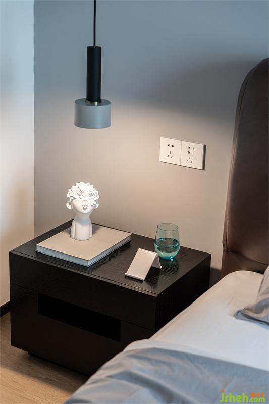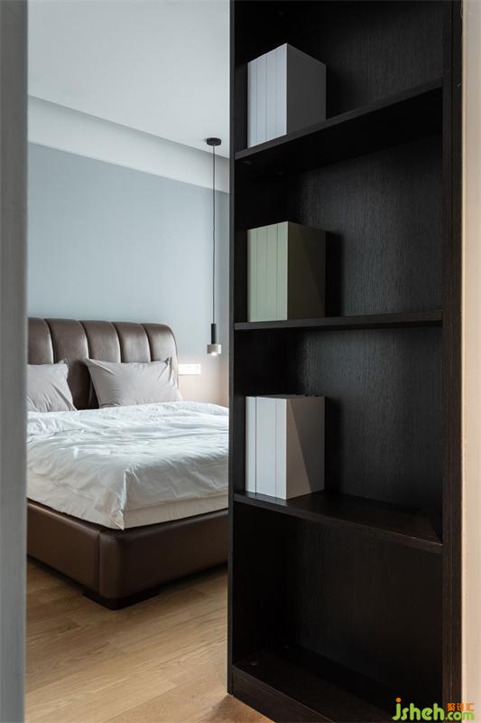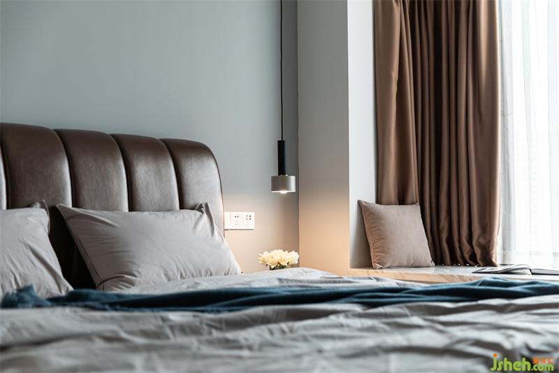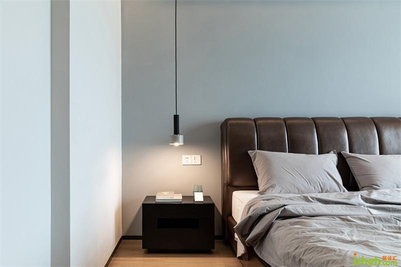 業(yè)主不希望主臥的整體色調(diào)過于沉重,能與客餐廳有所區(qū)別。惠州裝修設(shè)計(jì)最終選用淺灰藍(lán)色做基調(diào),搭配深褐色床架和窗簾,加上橡木色地板,吊燈、床品和床背景灰藍(lán)色交相呼應(yīng),整體淡雅清新。