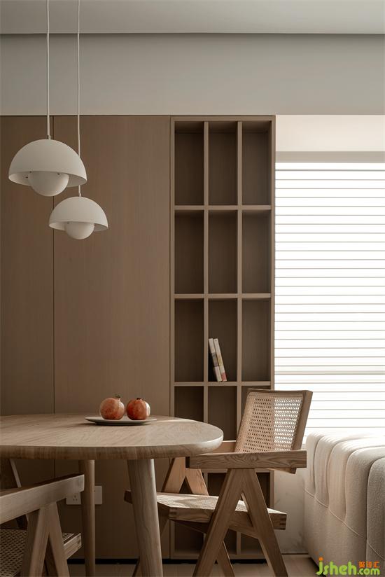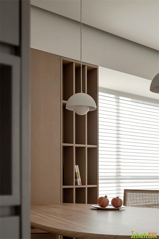 餐廳精心挑選了帶有圓弧造型的吊燈,跟空間硬裝同樣的圓弧是一種“對話”??看暗墓褡?,滿足業(yè)主日常收納需求,同時(shí)具有秩序美感,是一種松與緊、疏與密的處理方式。