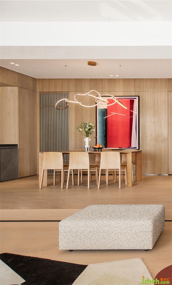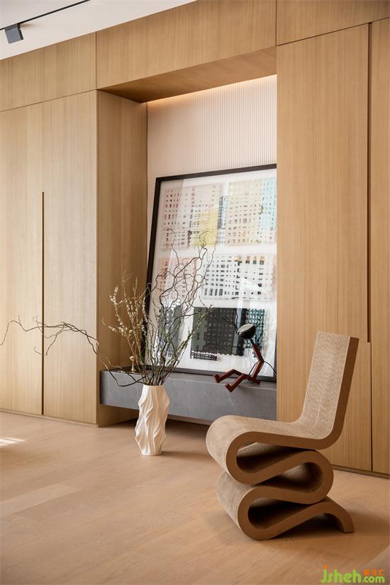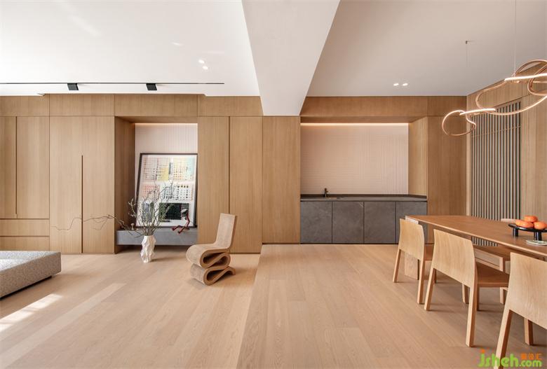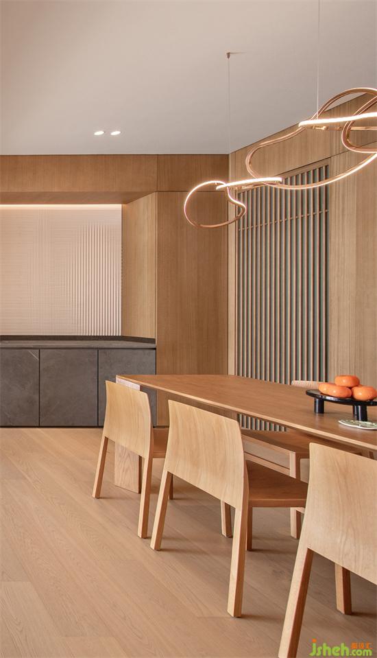 簡(jiǎn)潔的立面與質(zhì)樸的空間氣質(zhì)交映在溫潤(rùn)的木飾面,在光影間折射成一片自然之色。
