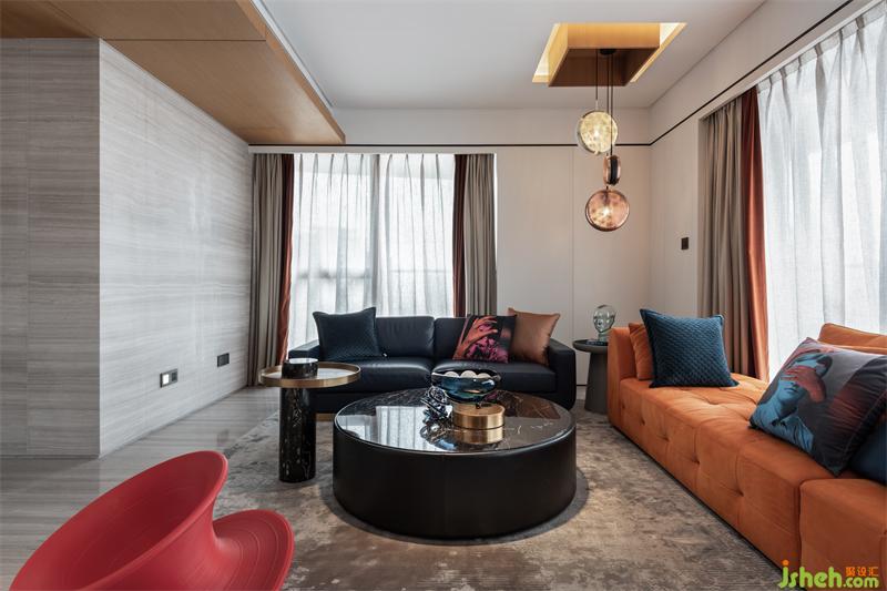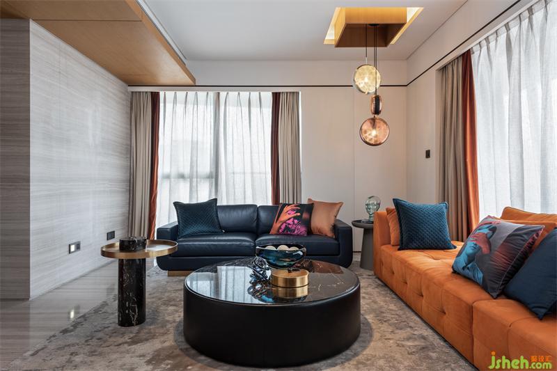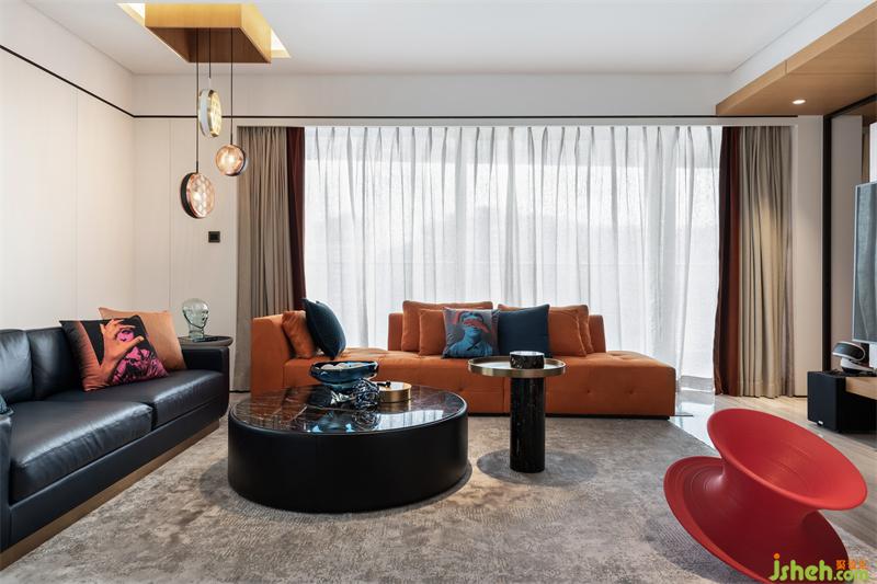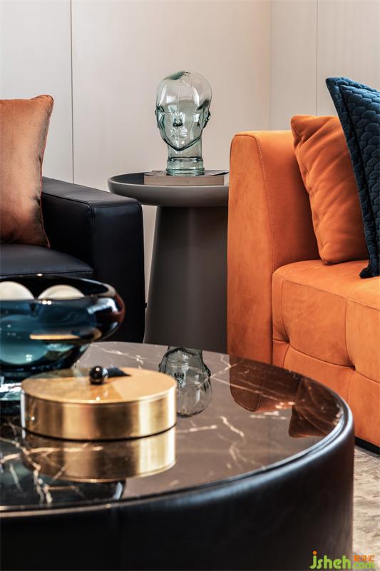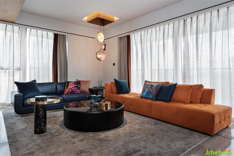 鮮橙的沙發(fā)倚窗而立,映著窗外的陽(yáng)光,張揚(yáng)著火熱的生機(jī)與力量;側(cè)邊則搭配了布魯氏藍(lán)的背靠式沙發(fā),中和的鮮橙帶來(lái)的熱鬧,空間角落瞬顯沉靜內(nèi)斂。正上方熠熠的金屬吊燈,也參與著這場(chǎng)歡快的交響演奏。