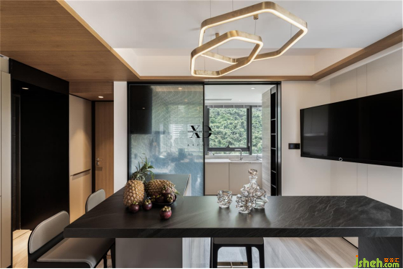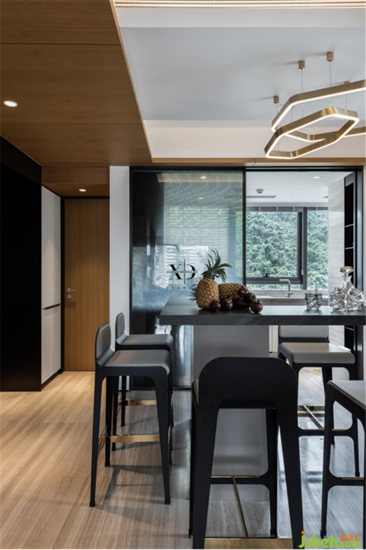 結(jié)合主人的生活所需,廚房及餐廳的功能性被削弱,社交性的考量也是如今年輕人更為亟待的需求。L型吧臺(tái)搭配高腳椅,高級(jí)而精致的磨砂黑,時(shí)尚與藝術(shù)也從客廳延續(xù)。
