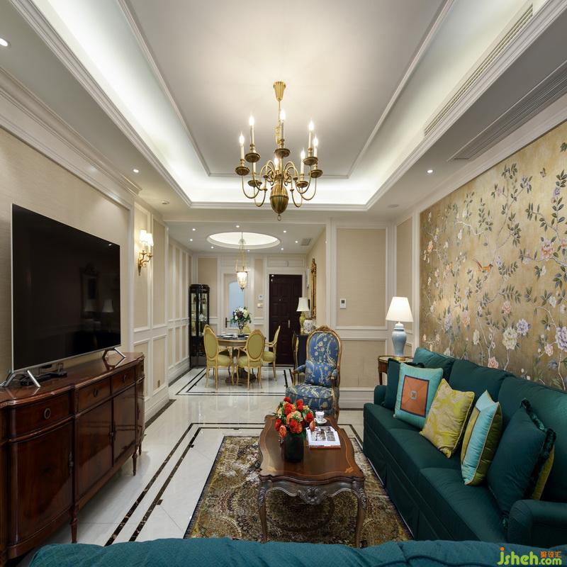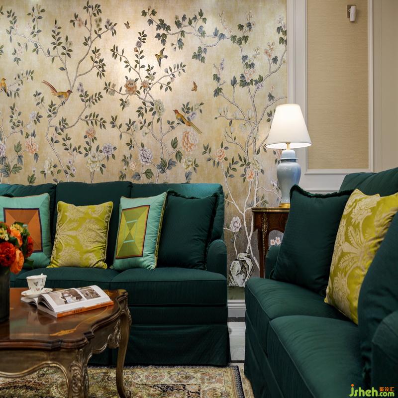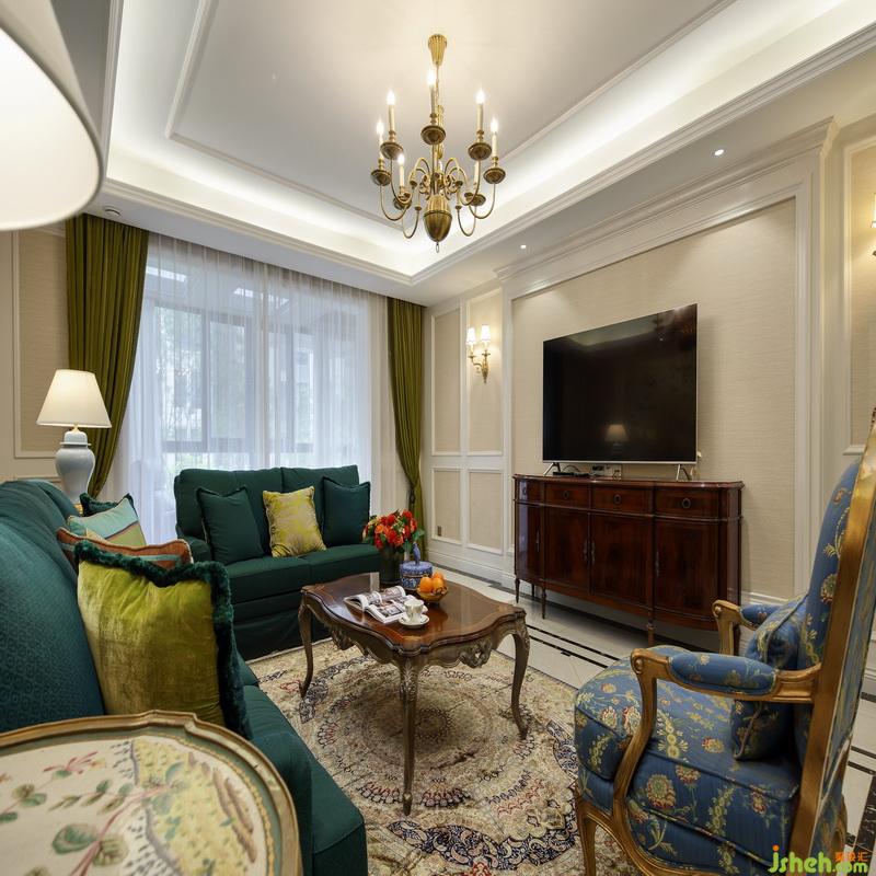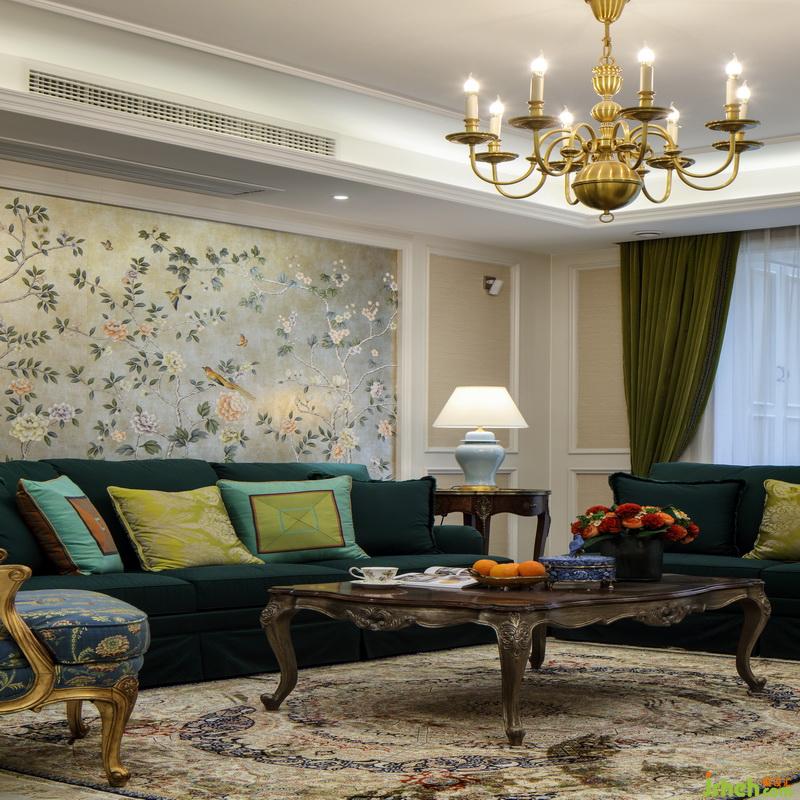 客廳作為待客區(qū)域,室內(nèi)設(shè)計(jì)師硬裝上沒有做太多的造型,背景也以淺色為主,美式獨(dú)有的濃墨重彩,在軟裝搭配和家具上體現(xiàn)的淋漓盡致??蛷d中間寬大的主沙發(fā)厚重、舒適,墨綠色作為主沙發(fā)色,也成為整個(gè)客廳的點(diǎn)睛色,墨綠是非常高雅的顏色,雅得明朗、雅得有生命力,非常能顯示出主人家的品位。