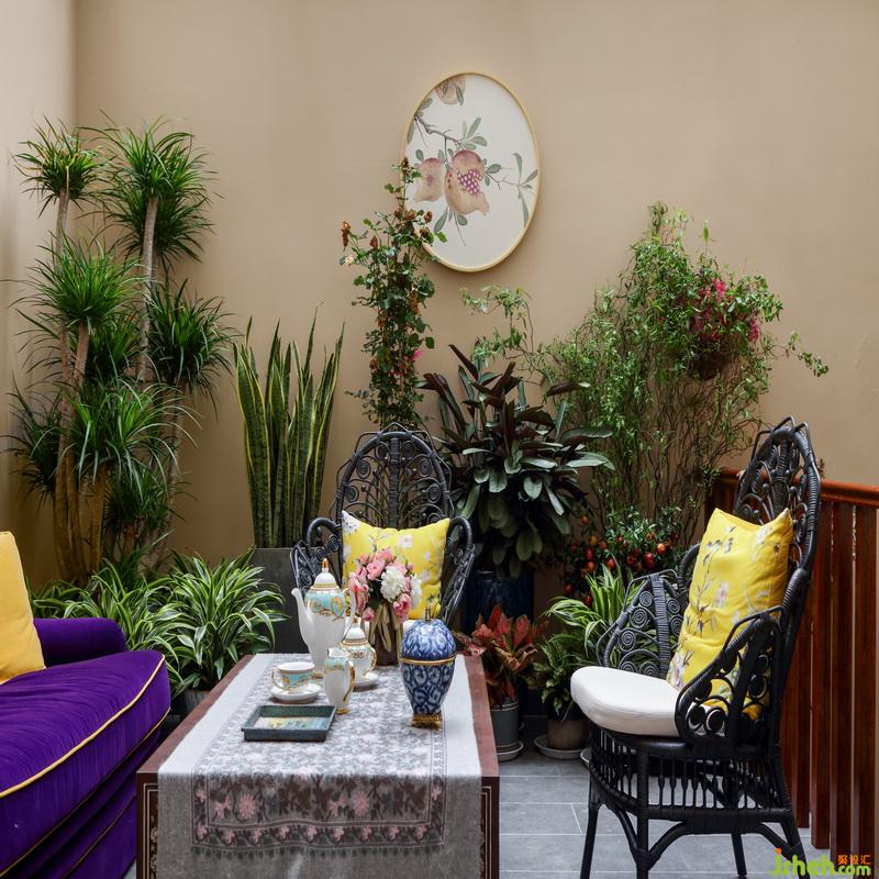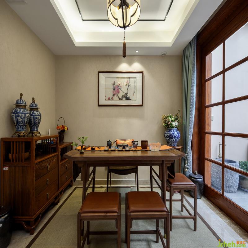 地下茶室以新中式風(fēng)格為主,中間的翹頭案是中堂文化中不可或缺的重器,傳統(tǒng)上的固定陳設(shè),給人營造一種雅致的氛圍。翹頭案后面的圈椅,墻邊的邊柜,包括角落的木質(zhì)圓幾、陶瓷花瓶,都帶著傳統(tǒng)文化的感覺,一種書香氣息,油然而生。